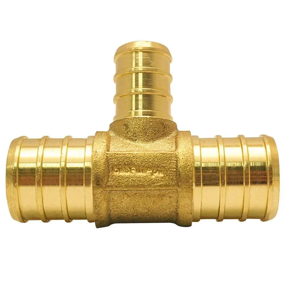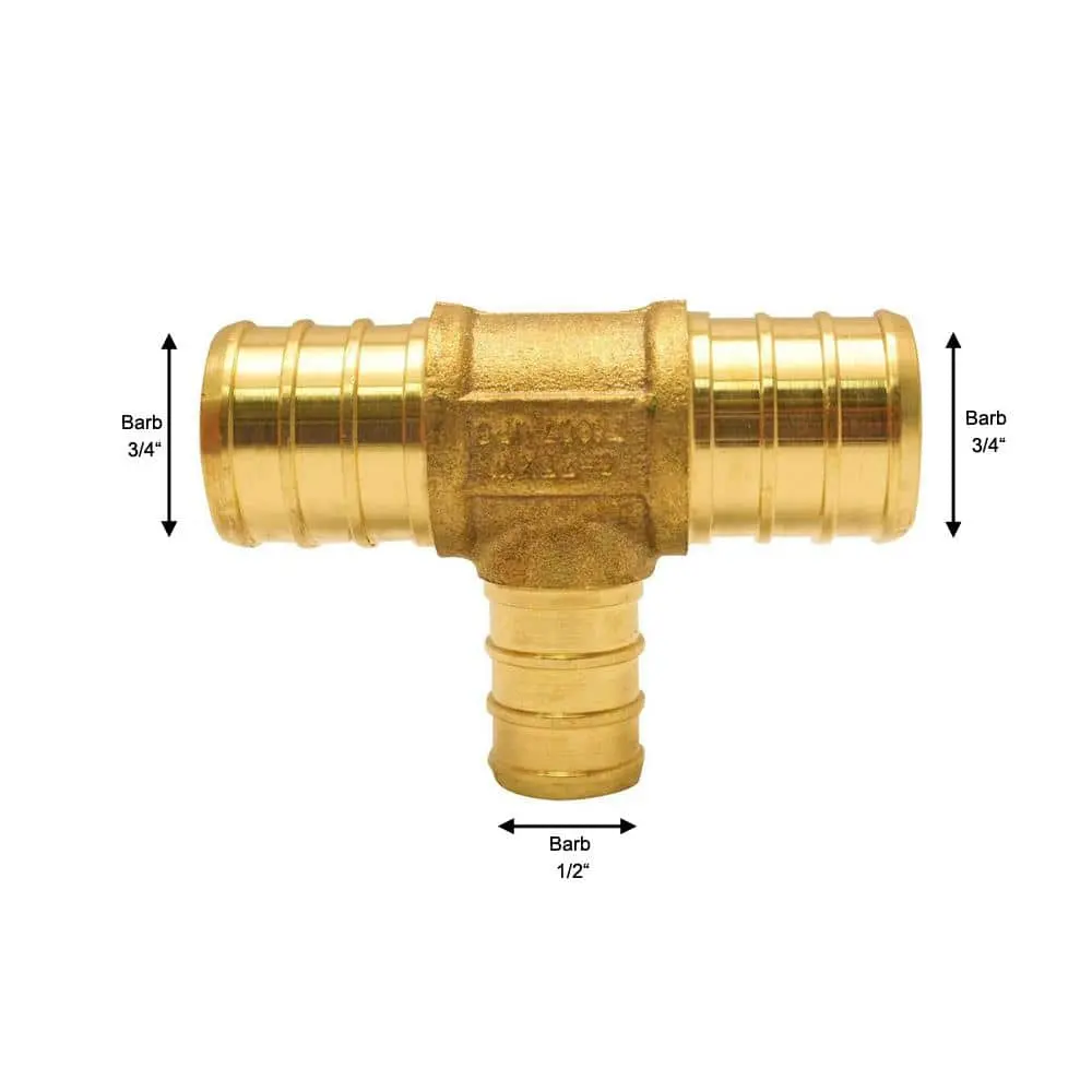 The ApolloPEX 3/4 in. x 3/4 in. x 1/2 in. Brass PEX Barb Reducing Tee is easy to install and is a key component in cost-effective potable water piping systems. It is also suitable for integration into hydronic heating systems. The tee can be secured using copper crimps, stainless steel pinch clamps, or crimp sleeves (sold separately). The ApolloPEX system offers a comprehensive piping solution with brass fittings, poly alloy fittings, manifolds, valves, fasteners, tools, and tubing for both simple and complex water delivery systems.