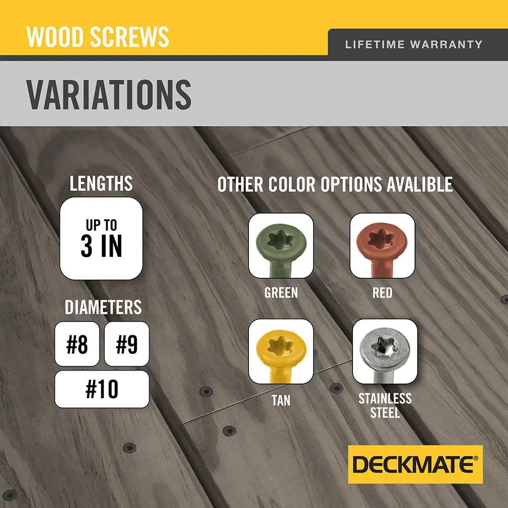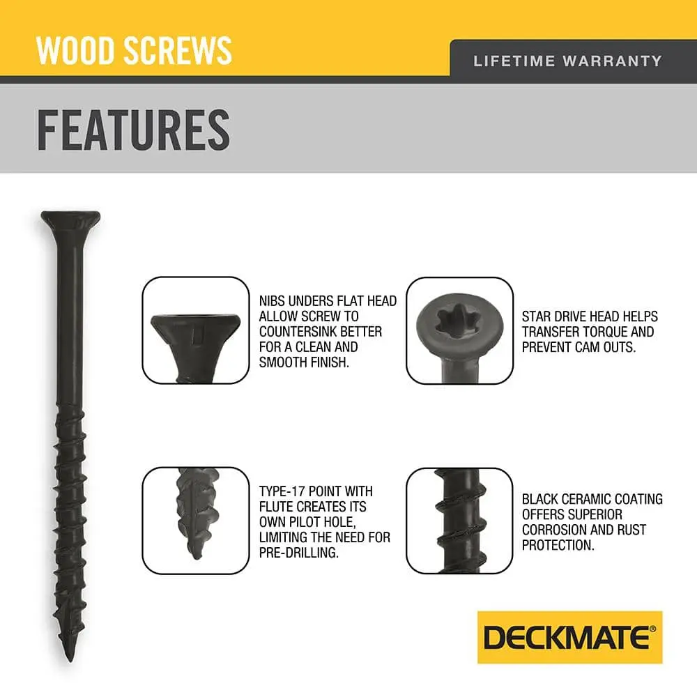 Deck Mate Black deck screws are built for long-lasting performance and a sleek finish to complement your decking. Featuring star-drive technology, they are twice as durable as Phillips drives and minimize stripping. The black ceramic coating offers four layers of rust and corrosion protection, making these screws ideal for treated lumber applications.