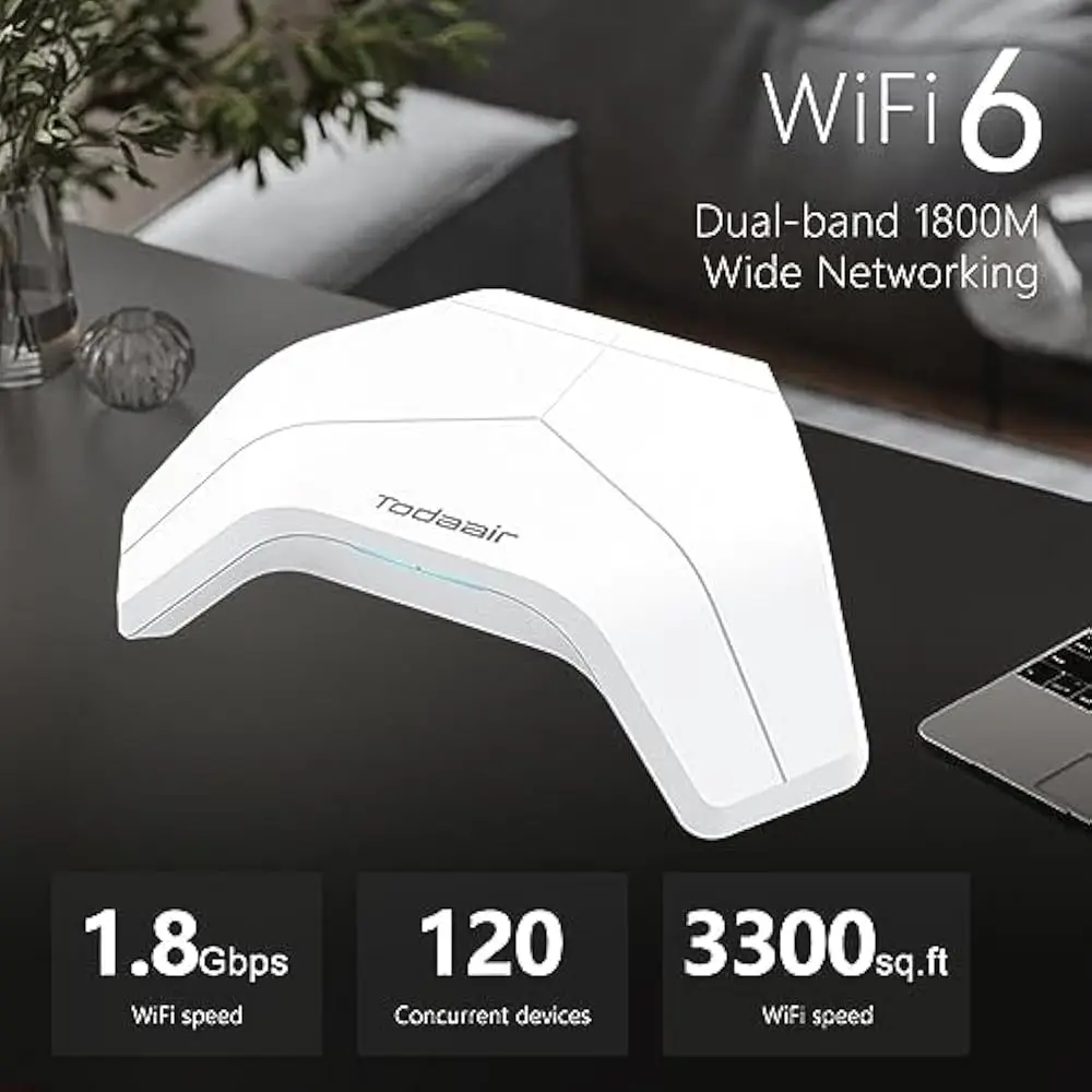 he Mesh WiFi 6 Router delivers AX1800 wireless speed (up to 1.8Gbps) for fast and reliable internet. With 3 Gigabit LAN ports, it offers stable wired connections for multiple devices. Designed to cover up to 3300 sq. ft, this router can support 120+ devices, making it perfect for large homes or offices. It utilizes the latest WiFi 6 technology, providing enhanced speed, capacity, and performance for seamless streaming, gaming, and browsing. Ideal for modern smart homes with high-speed internet needs.