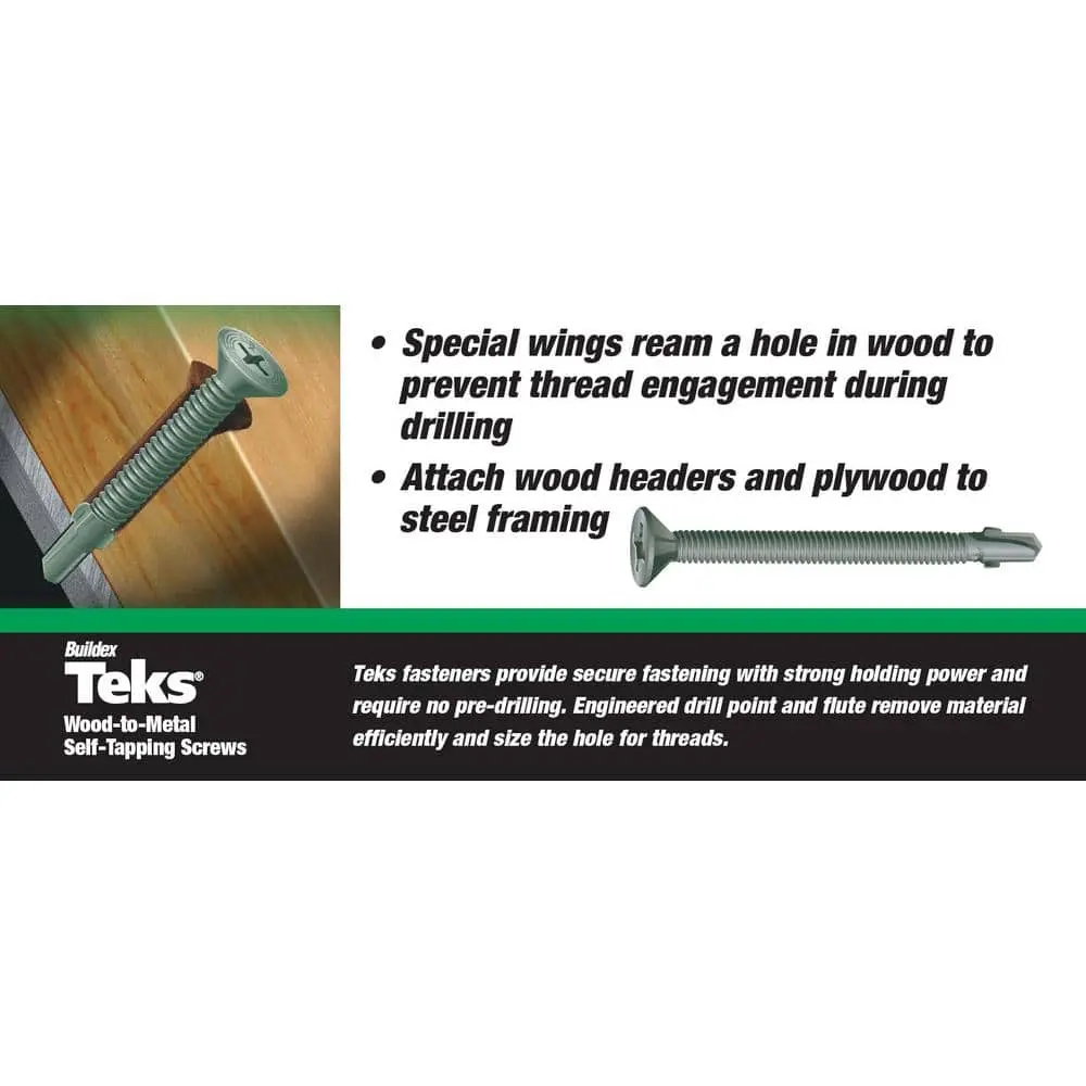 Teks 12 x 2-3/4 in. Phillips Wood-to-Metal Self-Tapping Screws with Wings (40-Pack) allow you to secure wood to metal without the need for pre-drilling. These screws are perfect for use with 1/4 in. to 16 gauge steel. Special wings ream a hole in the wood to prevent thread engagement while drilling, and they break away once self-tapping into metal, ensuring a secure hold. Easily install with a drill or impact driver and a 3 Phillips bit—no pre-drilling needed. Ideal for fastening applications like attaching wood headers and plywood to steel frames.
