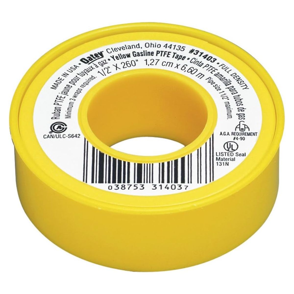 The 1/2 in. x 260 in. Yellow PTFE Tape by Oatey is designed for sealing metal and plastic threads effectively. Made from PTFE, it offers superior tensile strength compared to standard white tape. This tape is specifically manufactured for use with natural gas, propane, butane, water, oil, and chemical lines. It boasts a higher density of 1.35 - 1.50 g/cubic centimeters and is 4 mils thick. The product complies with various specifications including MIL-T-22230A (ASG), UL 31 RO, AGA 3226, and CAN/ULC-S642, ensuring its reliability and safety for diverse applications. Packaged on spools within a convenient dispenser box, it has an indefinite shelf life, making it a practical choice for professional and DIY plumbing projects alike.