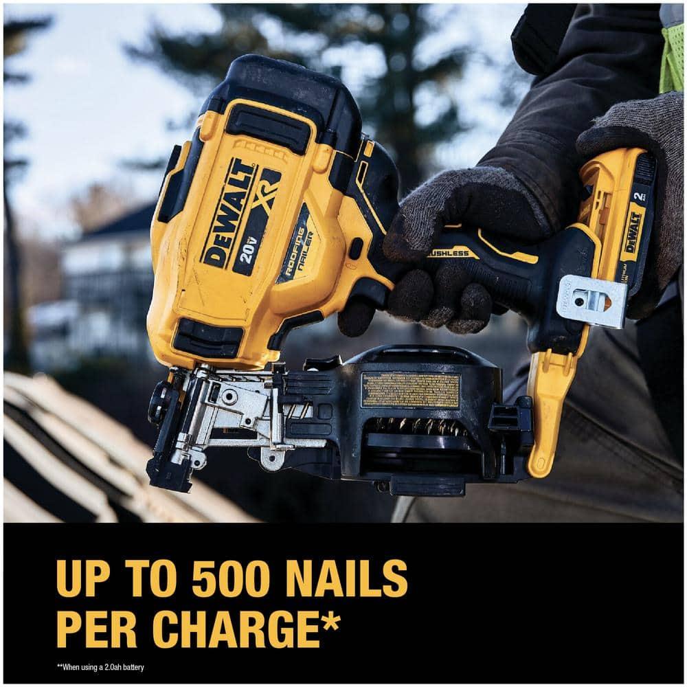 The DEWALT 20-Volt MAX 15° Cordless Coil Roofing Nailer offers the ultimate in cordless convenience, perfect for service repairs and small projects. It operates entirely on battery power, eliminating the need for hoses, compressors, or gas cartridges, allowing professionals to start work immediately. This nailer can drive roofing fasteners ranging from 3/4 in. to 1-3/4 in. and features bump actuation mode and tool-free depth adjustment for fast, efficient, and precise nail placement.