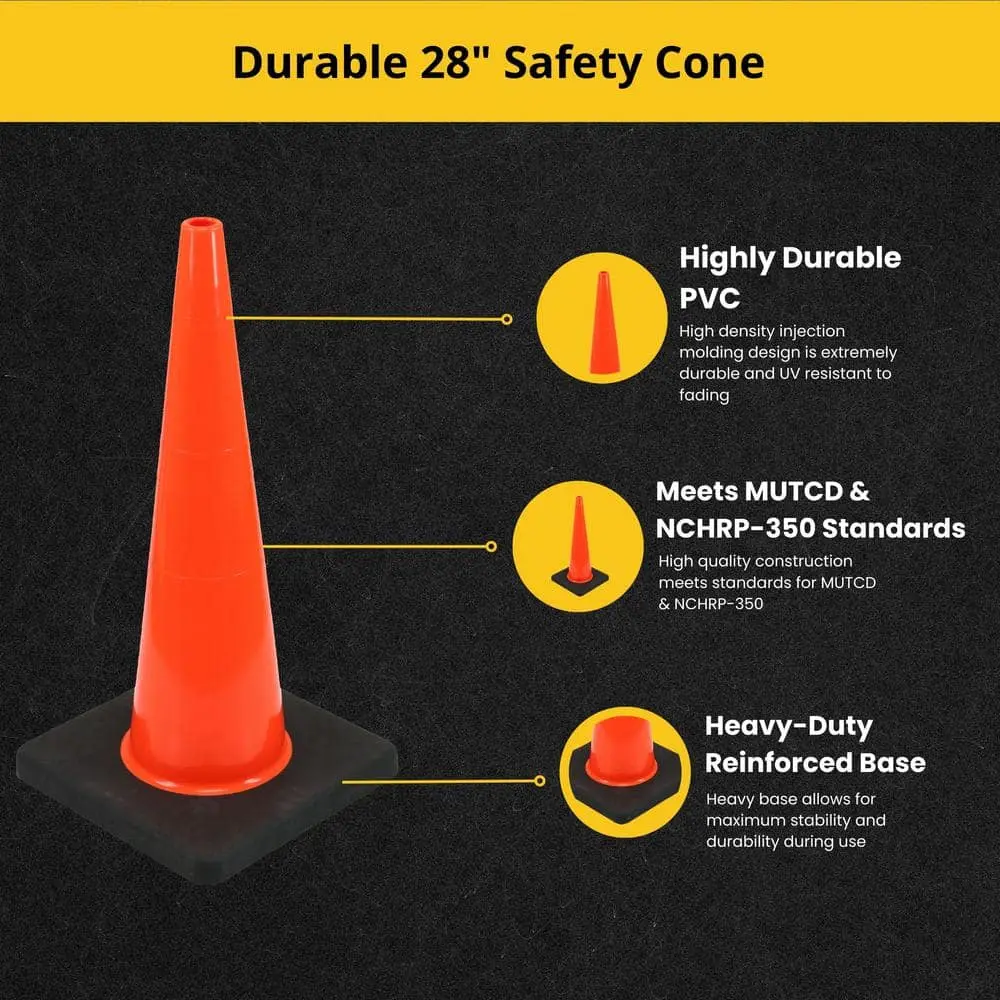 Designed to meet MUTCD and NCHRP-350 standards, this high-density vinyl traffic cone offers exceptional durability, flexibility, and stability. Its fluorescent color ensures maximum visibility, even in adverse weather conditions. The UV-resistant coating prevents fading and sun bleaching for long-lasting brightness.