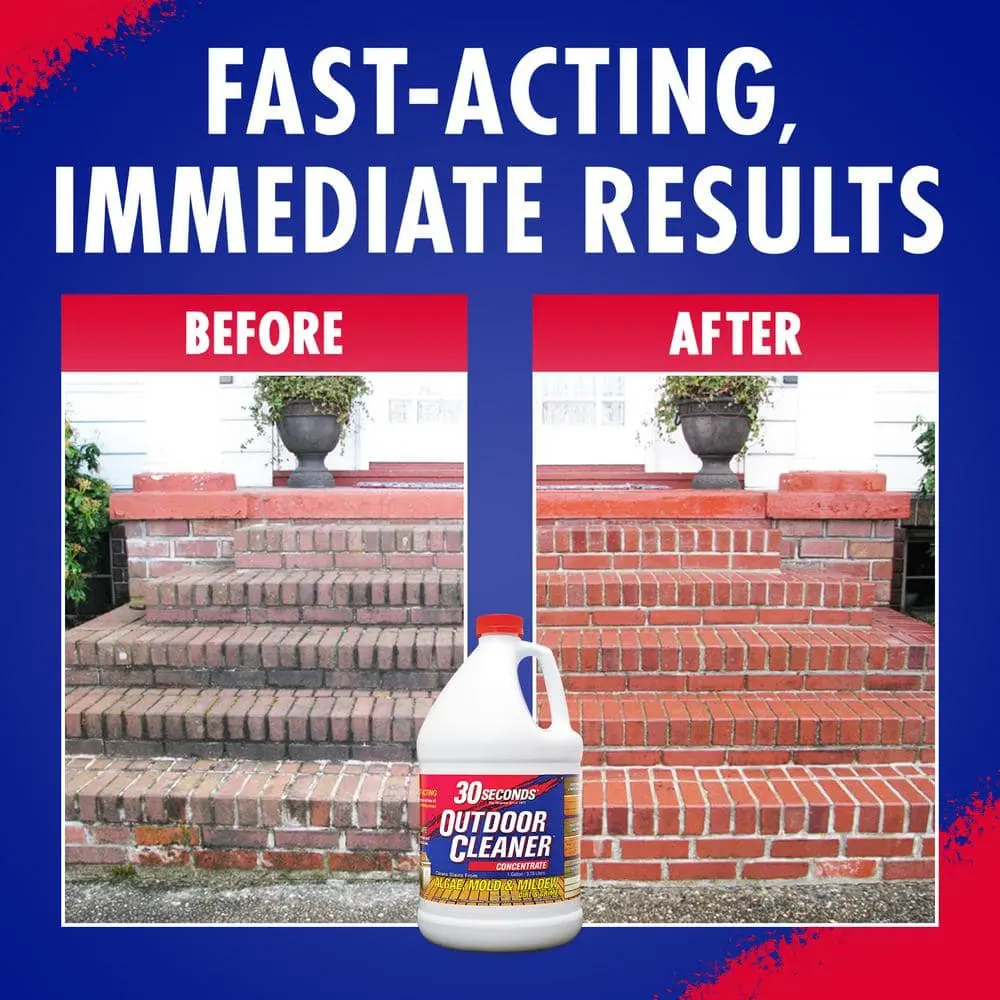 Since 1977, 30 Seconds Cleaners have been the original and still the best outdoor cleaners, perfect for removing stains from algae, mold, and mildew or killing lichen and moss. Unlike noisy, expensive pressure washers, 30 Seconds Cleaners provide a fast-acting, instant clean that tackles dirt and grime effortlessly. Simply spray on, brush if needed, and rinse away stains without harming your lawn or landscaping. Available in various sizes at Home Depot, this cleaner is ideal for jobs of any size, from home exteriors to garden ornaments. For larger surfaces, 30 Seconds Spray & Walk Away is a great option, as it works over time to kill lichen, moss, mold, and algae without the need for rinsing. This treatment is perfect for areas like roofs, decks, sidewalks, and driveways, offering gradual results with no immediate cleanup required. Safe for all outdoor surfaces, 30 Seconds Cleaners give you the flexibility to choose between an instant clean or a longer-term treatment, ensuring your outdoor spaces stay clean when you want them to.