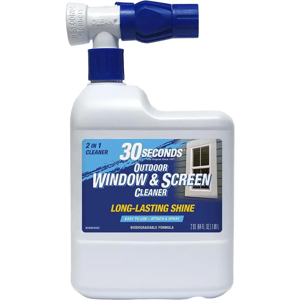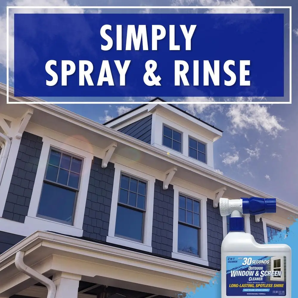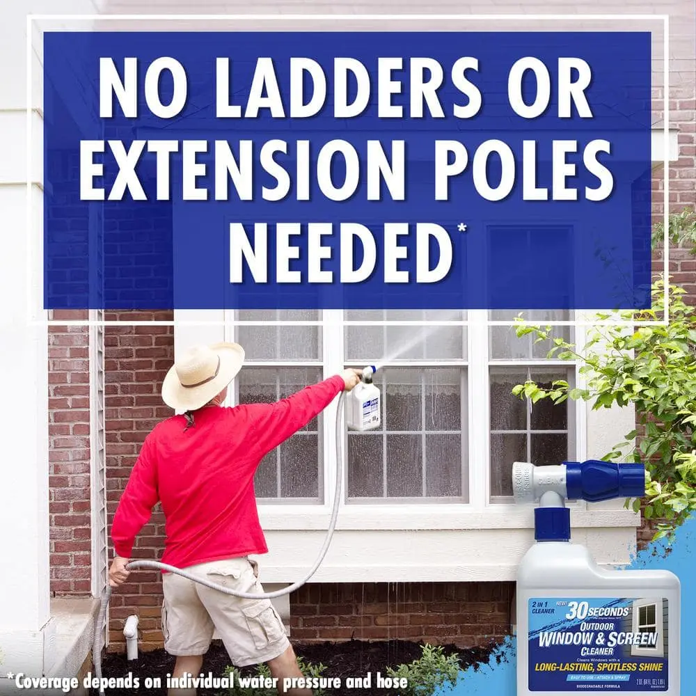 30 Seconds Outdoor Window & Screen Cleaner effortlessly cleans windows, screens, and glass while leaving a long-lasting shine. Just attach the bottle to your garden hose and follow the instructions for easy use. The fast-acting formula sprays directly onto glass or screens, so there's no need to remove them, simplifying your outdoor cleaning. With a reach of up to 24+ feet, you can clean high windows without the hassle of a ladder!