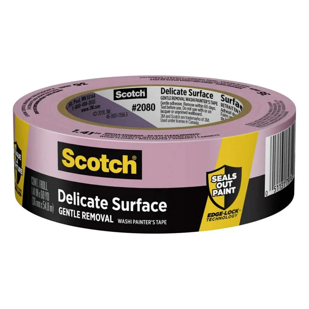 The 3M Scotch 1.41 in. x 60 yds. Delicate Surface Painter's Tape with Edge-Lock features Edge-Lock Technology, which prevents paint bleed, ensuring sharp, clean lines for a professional finish. Specifically designed for delicate surface use, it’s safe for freshly painted or sensitive surfaces. The tape offers gentle adhesion, sticking securely while removing easily without causing any damage. With its generous 1.41 in. x 60 yds. size, it provides extended coverage for larger projects. It is also UV resistant, making it perfect for both indoor and outdoor applications