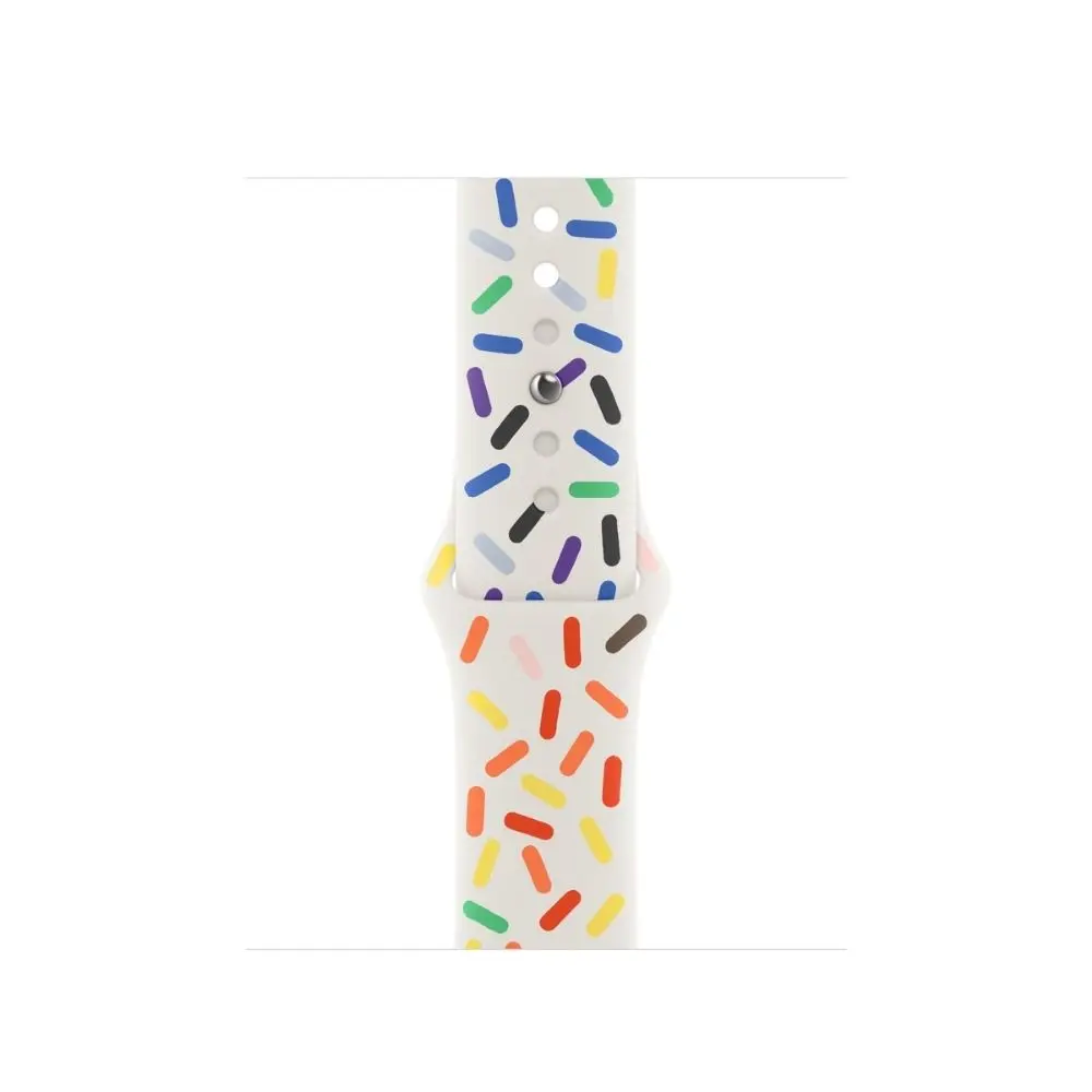 The 41mm Pride Edition Sport Band - S/M celebrates inclusivity and style with its vibrant Pride Edition design. Made from durable high-performance fluoroelastomer, it is soft, smooth, and perfect for all-day comfort. The pin-and-tuck closure ensures a secure and clean fit, while the 41mm size provides a snug, comfortable feel. This band is a bold and versatile accessory for any occasion.