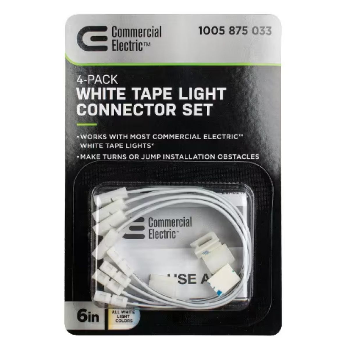 This installation allows for the customization of white tape lights. It is designed to accommodate short jumps and turns. It is compatible with all CE white tape lights. The connector set consists of four 6-inch snap connectors and four wire mounting clips. It is an ideal choice for undercabinet LED lighting.