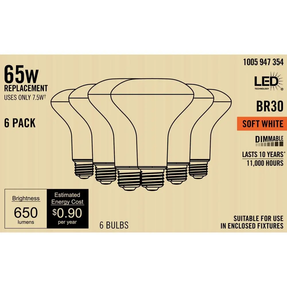 Enjoy the long-lasting performance and energy savings of this dimmable LED BR30 Flood Light Bulb. Designed to replace any 65W incandescent or halogen bulb, this Soft White (2700K) LED bulb is perfect for kitchens, living rooms, and dining rooms. Ideal for use in recessed can lights, it offers the convenience of fewer replacements over the years, especially in hard-to-reach areas that often require a ladder. With energy efficiency and extended lifespan, this bulb helps reduce both the hassle of frequent bulb changes and the cost of high energy bills, keeping your spaces illuminated without worry.