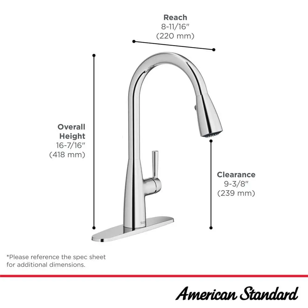 The American Standard Fairbury 2S Single-Handle Pull-Down Dual Spray Faucet enhances your kitchen with its sleek design and top-notch functionality. Its high-arc swivel spout makes filling large pots effortless, while the ergonomic, pull-down spray head offers easy access to stream, spray, and pause with a push-button. The Re-Trax system ensures smooth pull-down and retraction. This faucet is compatible with 1 to 4-hole sink or countertop installations, making it an ideal choice for any kitchen update.