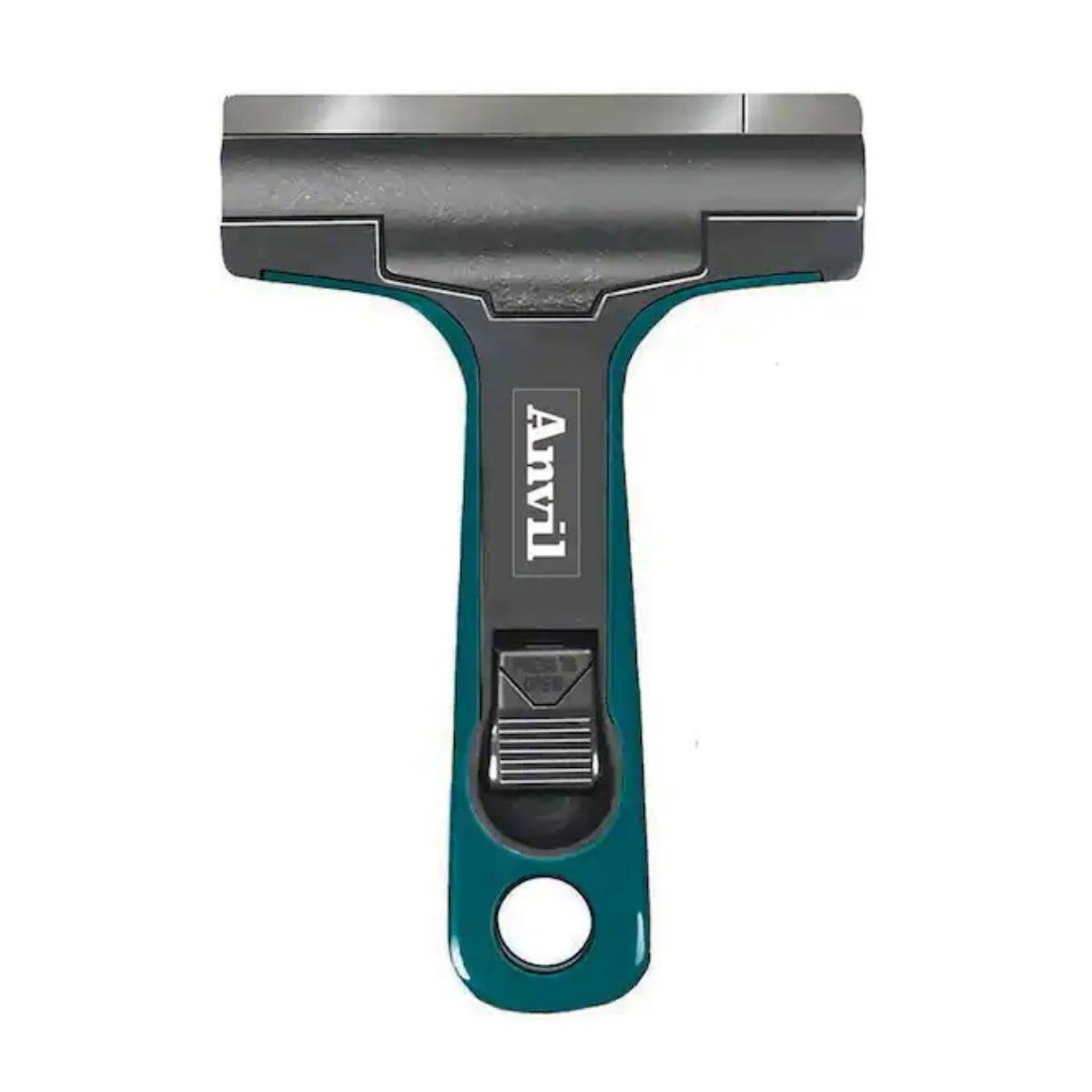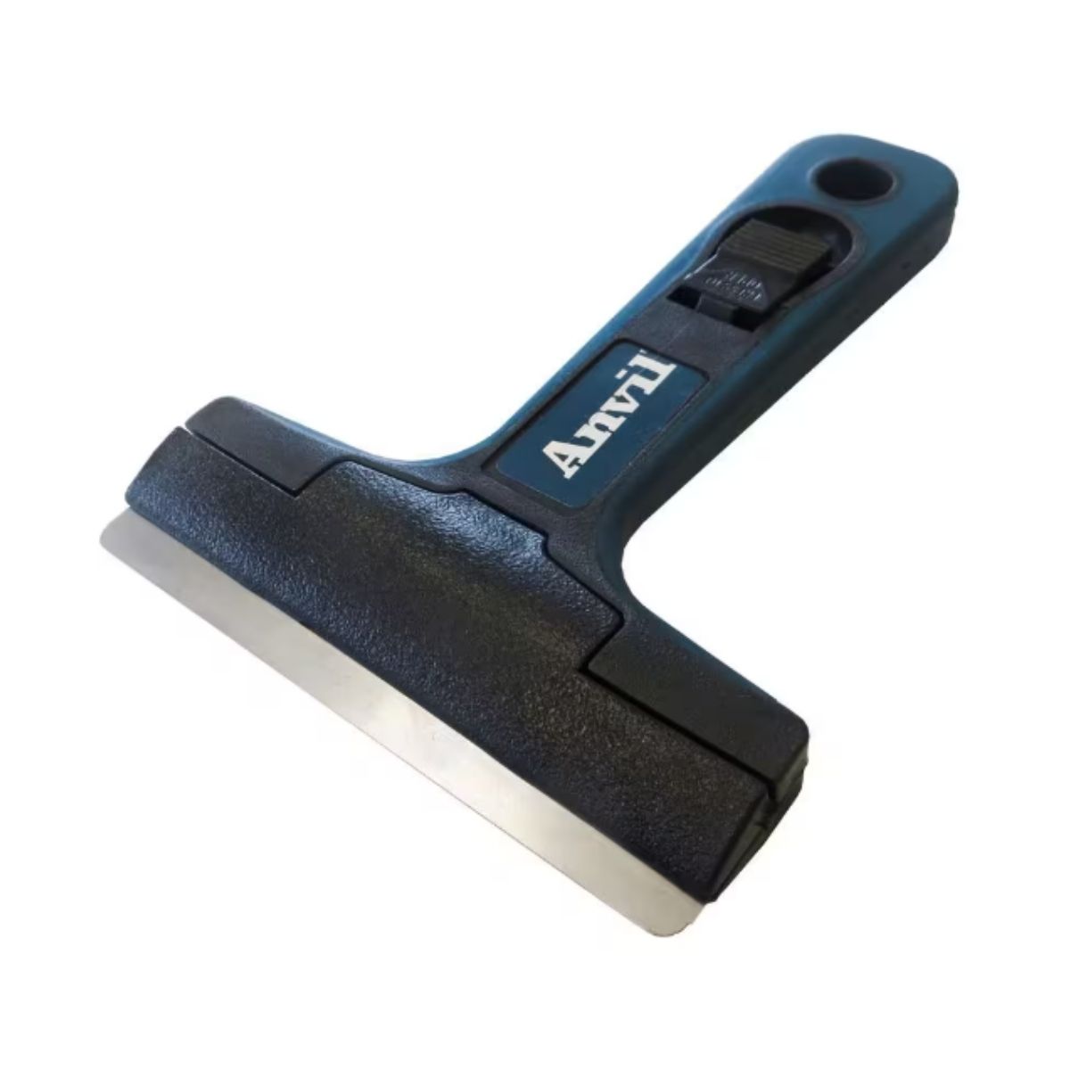 The soft-grip glass and tile scraper, measuring 4 inches, serves multiple scraping purposes on various surfaces such as glass, tile, metal, flooring, and other flat surfaces. This scraper is equipped with a push button opening and locking mechanism, ensuring safe and convenient blade replacement and maintenance.