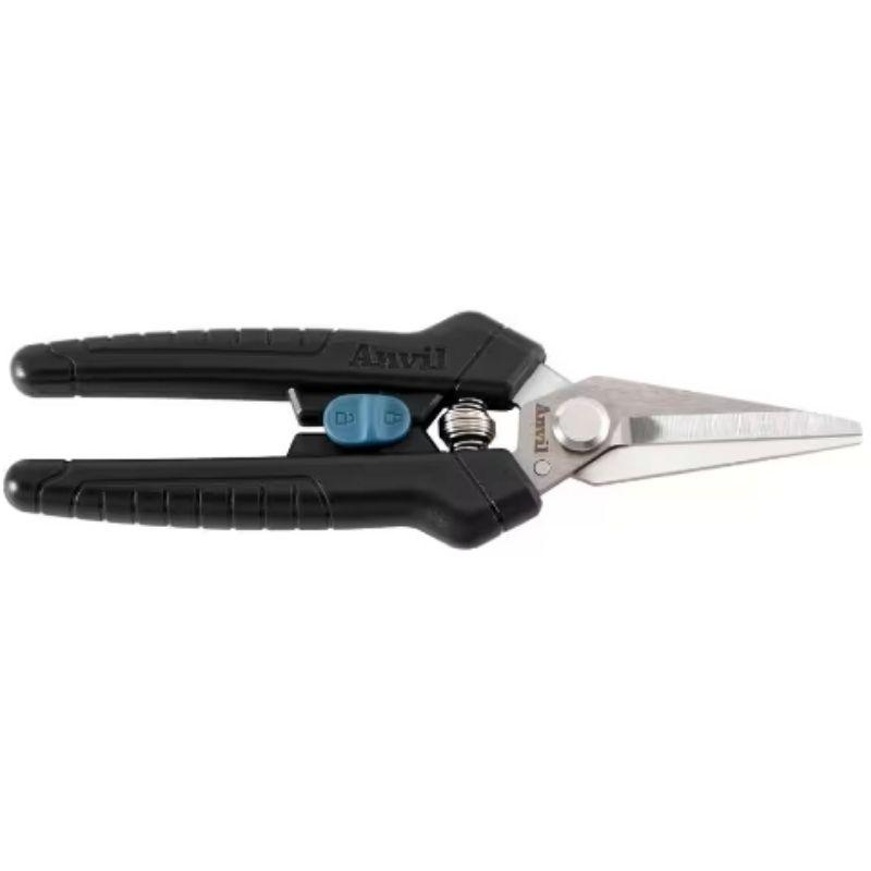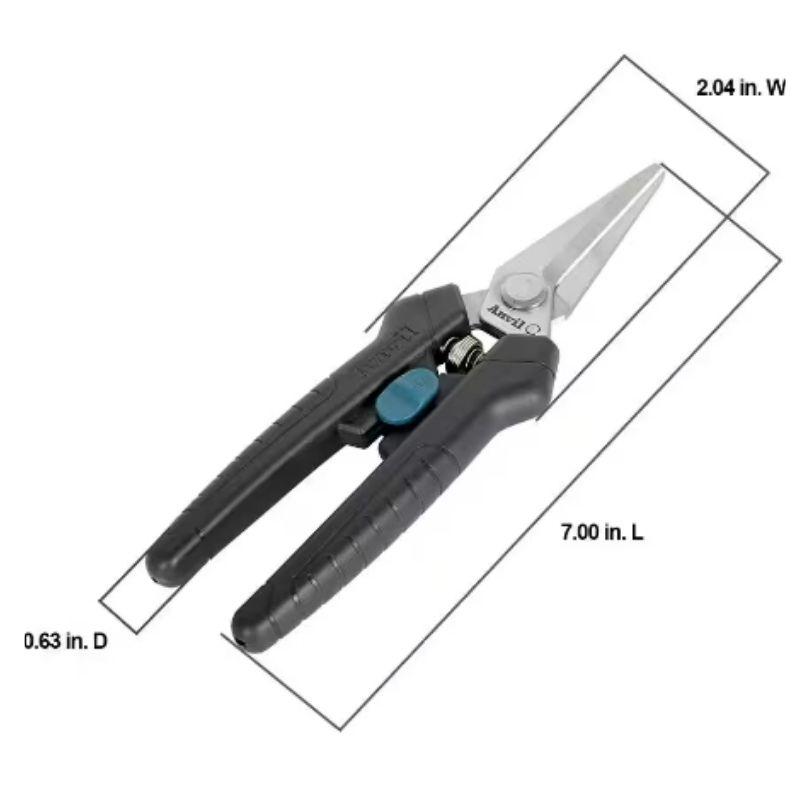 The Anvil 7 in. Pruning Snip is designed for precise and efficient cutting of small branches and stems. Description: Blade Length: Approximately 7 inches Blade Material: Typically made from high-carbon steel or stainless steel, offering durability and sharpness for clean cuts. Cutting Mechanism: Features an anvil cutting mechanism, where one blade cuts against a flat surface (anvil), making it suitable for cutting through dry or hard wood and thicker stems. This mechanism can be more effective for tougher cutting tasks compared to bypass shears. Handles: The handles are usually ergonomically designed for comfortable use, with non-slip grips to reduce hand strain and improve control. They may also be cushioned or padded for added comfort during extended use. Cutting Capacity: Designed to handle branches and stems up to about 1/2 inch to 3/4 inch in diameter, depending on the specific model and blade sharpness. Safety Features: Often includes a safety latch or lock to keep the blades closed when not in use, ensuring safe storage and handling. Usage: Ideal for pruning tasks such as cutting back woody plants, trimming stems, and handling more challenging cutting tasks where bypass pruners might struggle. These pruning snips are well-suited for gardeners who need a robust tool for tackling tougher pruning jobs and cutting through more resilient materials