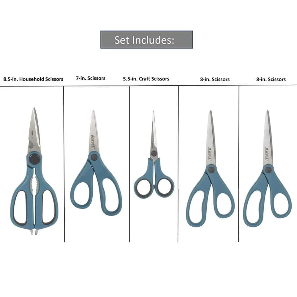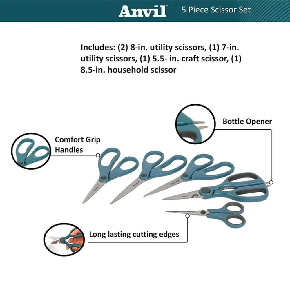 The Anvil Straight Scissors 5-Piece set is perfect for a variety of cutting tasks. It includes 5 versatile scissors designed for precision and ease of use. Featuring sharp stainless steel blades, these scissors ensure clean and accurate cuts every time. The comfortable, ergonomic handles provide a secure and effortless grip, while the durable construction guarantees long-lasting performance. Ideal for use in the home, office, or crafting projects, this set is a reliable addition to any workspace