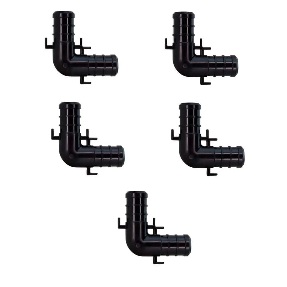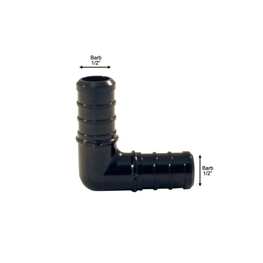The ApolloPEX 1/2 in. Plastic PEX Barb 90-Degree Elbow (5-Pack) is easy to install and provides an efficient solution for water piping systems. Made from poly alloy, it serves as an excellent alternative to brass in areas where water quality may negatively affect brass fittings. ApolloPEX barb fittings are essential for creating economical potable water piping systems and can also be used in hydronic heating systems. These elbows can be secured with copper crimps, stainless steel pinch clamps, or crimp sleeves (sold separately). The ApolloPEX system offers a complete piping solution, including fittings, manifolds, valves, tools, and tubing.