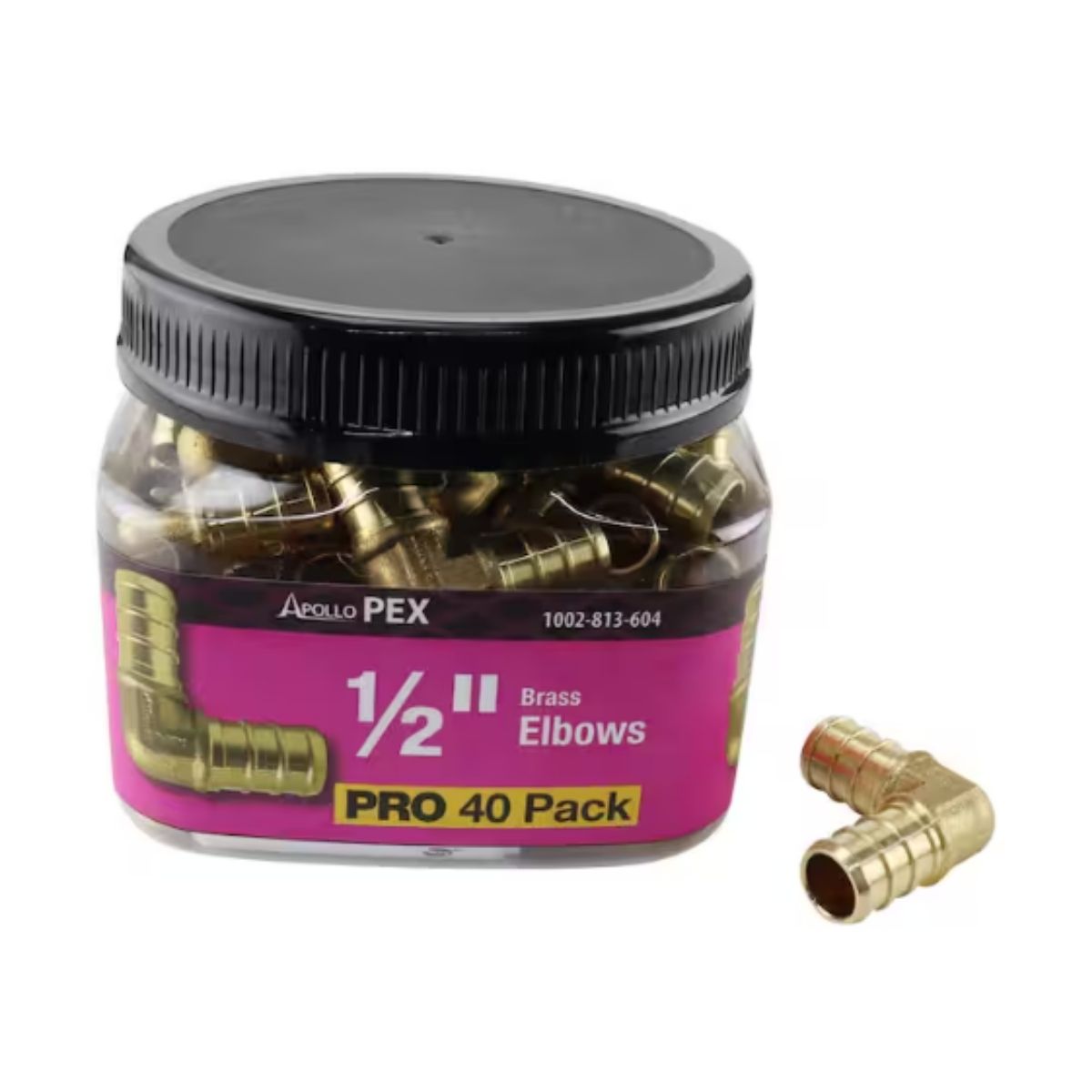 The ApolloPEX 1/2 in. Brass PEX Barb 90 Elbow Jar (40 Pack) is easy to install. ApolloPEX barb fittings are essential for affordable drinking water piping systems. They can also be used in hydronic heating systems, secured with copper crimps, stainless steel pinch clamps, or stainless steel crimp sleeves (all sold separately). The ApolloPEX system includes brass fittings, poly alloy fittings, manifolds, valves, fasteners, tools, and tubing for water delivery systems, whether simple or complex.