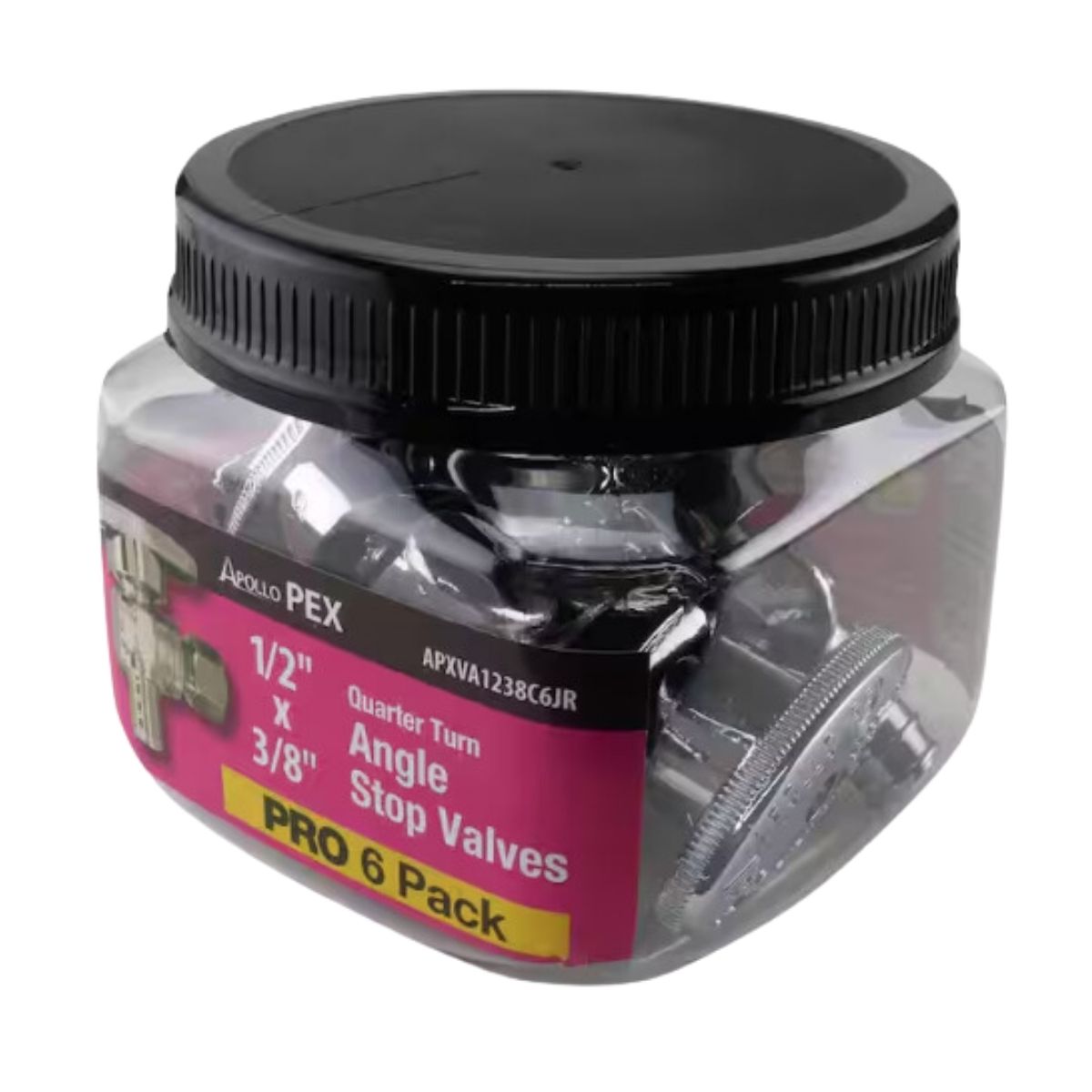 The ApolloPEX 1/2 in. Chrome-Plated Brass PEX Barb x 3/8 in. Compression Quarter-Turn Angle Stop Valve is straightforward to install and offers flow control via a quarter-turn ball valve. Primarily used at point-of-use fixtures, it allows for fixture repair and maintenance without disrupting the entire system's flow control. With a 3/8 in. compression outlet, it accommodates 3/8 in. O.D. tubing or supply lines. Designed for fixtures like dishwashers, toilets, and faucets, ApolloPEX barb fittings are vital components of cost-effective potable water piping systems and can integrate into hydronic heating systems. Secure the ApolloPEX valves with copper crimps, stainless steel pinch clamps, or crimp sleeves (all sold separately). This comprehensive ApolloPEX system includes brass and poly alloy fittings, manifolds, valves, fasteners, tools, and tubing for water delivery systems of any complexity.