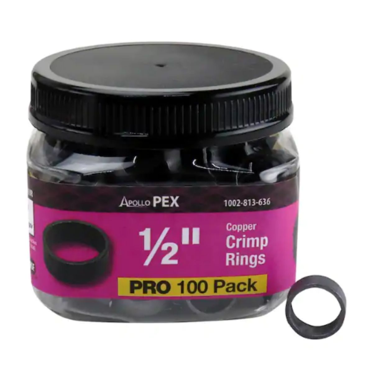 The ApolloPEX 1/2 in. Copper Crimp Ring (100-Pack) offers straightforward installation and is intended for use with PEX pipe and barb fittings (not included). Crafted from durable copper, these crimp rings require a crimping tool (sold separately) for installation. They are essential components for economical potable water piping systems and can integrate into hydronic heating systems. Compatible with brass and plastic fittings, valves, and manifolds (all sold separately), the ApolloPEX system provides a comprehensive range of components for water delivery systems, whether simple or complex.Pro pack includes 100 crimps rings in a reusable jarCompatible with PEX pipe (sold separately)Creates a solid and secure connection