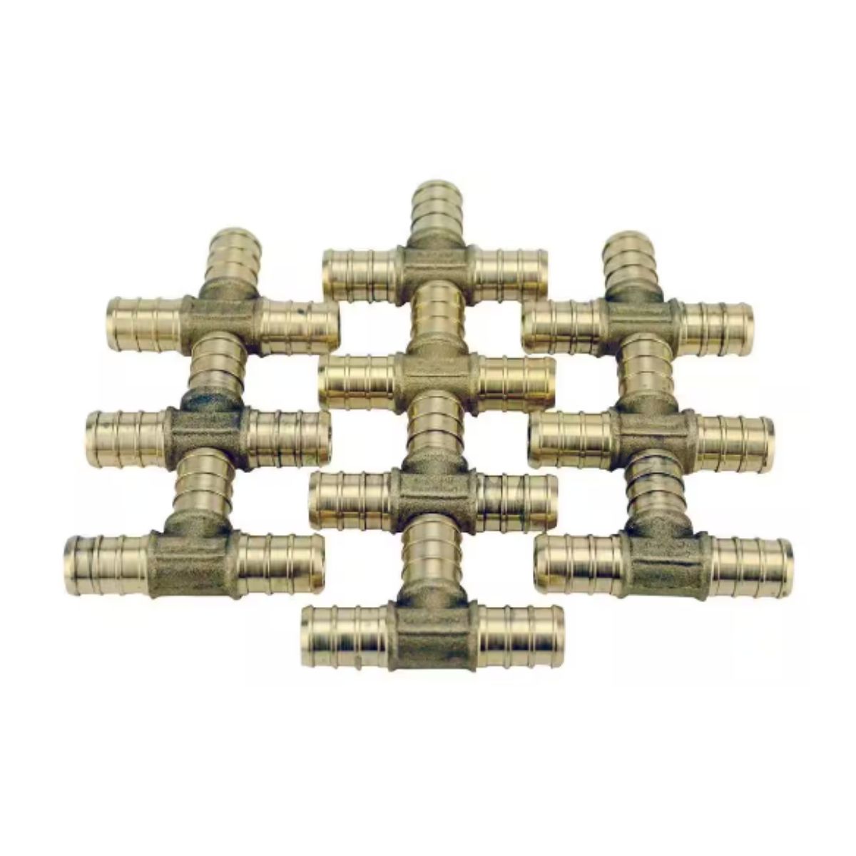 The ApolloPEX 1/2 in. Brass PEX Barb Tee (10-Pack) is easy to install. ApolloPEX barb fittings are crucial for cost-effective drinking water piping systems and can also be used in hydronic heating systems. These tees can be secured using copper crimps, stainless steel pinch clamps, or stainless steel crimp sleeves (sold separately). The ApolloPEX system includes brass fittings, poly alloy fittings, manifolds, valves, fasteners, tools, and tubing for water delivery systems, whether simple or complex.
