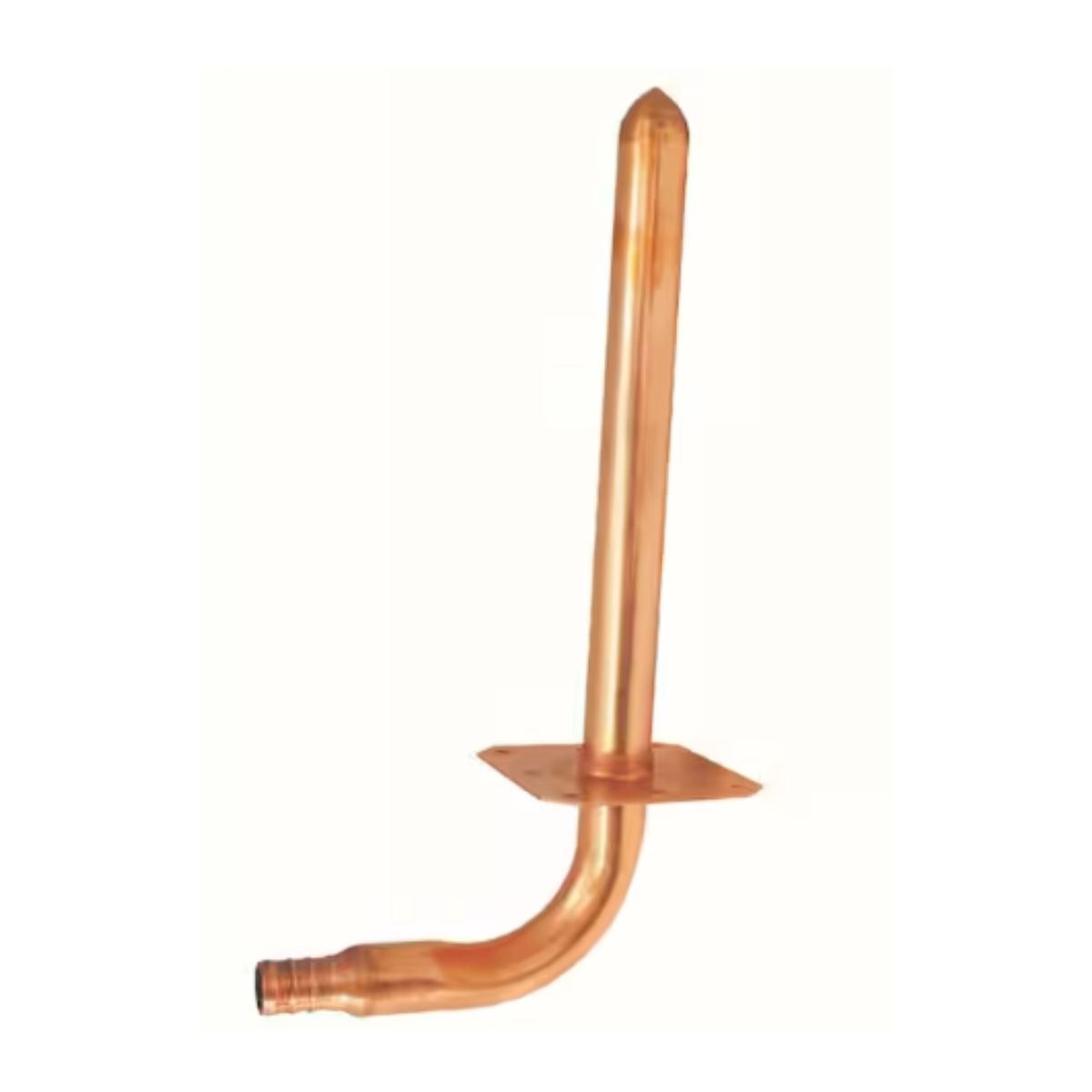 The ApolloPEX 8 in. x 1/2 in. Copper PEX Barb Stub-Out 90 Elbow with Flange offers excellent stability for stub-outs used for connecting stop valves to plumbing fixtures. Its integrated mounting flange ensures simple and secure installation of stub outs. This versatile product can be securely attached to studs, floor joists, ceiling joists, or other structural components. The ApolloPEX system provides a comprehensive piping solution including brass fittings, poly alloy fittings, manifolds, valves, fasteners, tools, and tubing, suitable for various water delivery systems, whether simple or complex.