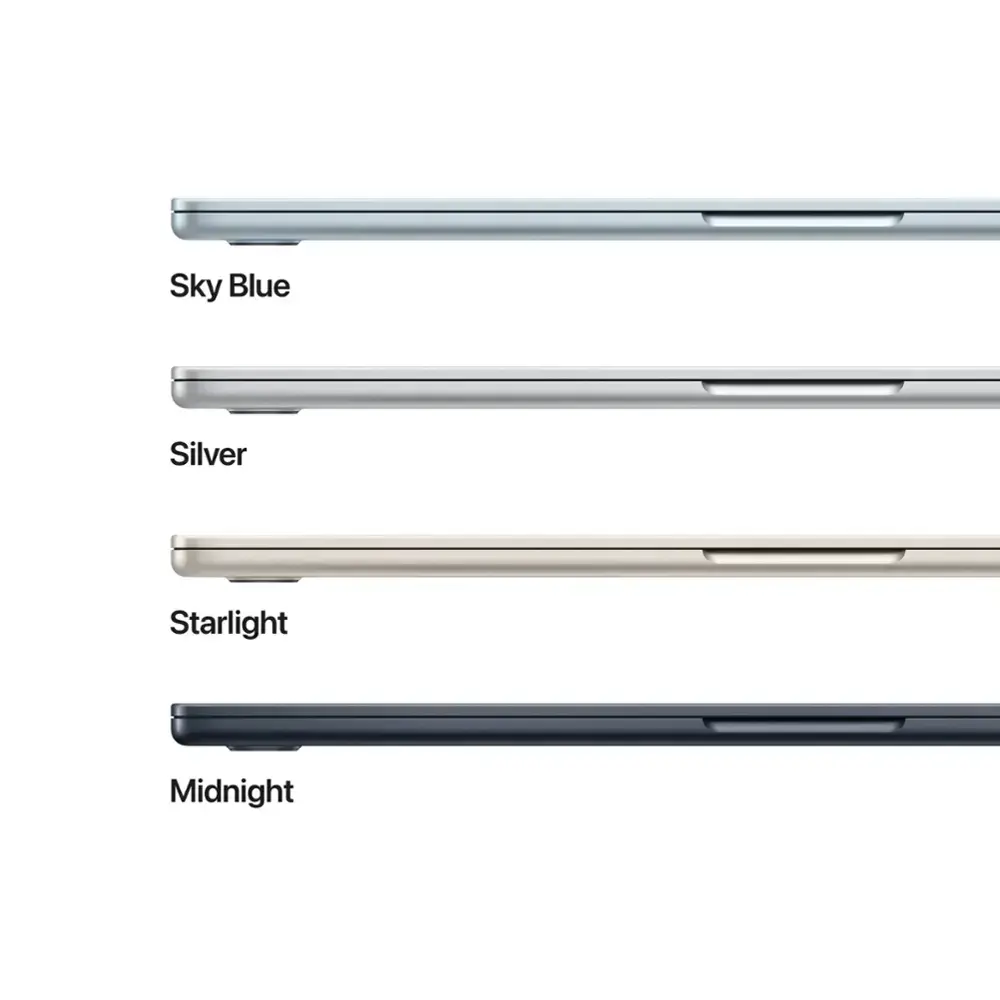 The MacBook Air 15-inch (2025) in Sky Blue is a powerful and lightweight laptop designed for efficiency and portability. It features a 15.3-inch Retina LED display with a resolution of 2880 x 1864, delivering sharp visuals. Powered by the Apple M4 chip with a 10-core CPU and a 10-core GPU, it ensures smooth performance for multitasking and creative workflows. The device includes 16GB of RAM and a 512GB SSD for ample storage and fast access to files. Running on macOS Sequoia 15.1, it offers a seamless user experience with advanced features. Connectivity options include two Thunderbolt 4 ports, Wi-Fi, and Bluetooth. The laptop is equipped with a front-facing camera for video calls, a backlit keyboard for comfortable typing in low-light conditions, and a 6-cell lithium-polymer battery for long-lasting power. It measures 0.45 inches in height, 13.4 inches in width, and 9.35 inches in depth, with a weight of just 3.33 pounds, making it an excellent choice for professionals and students on the go.