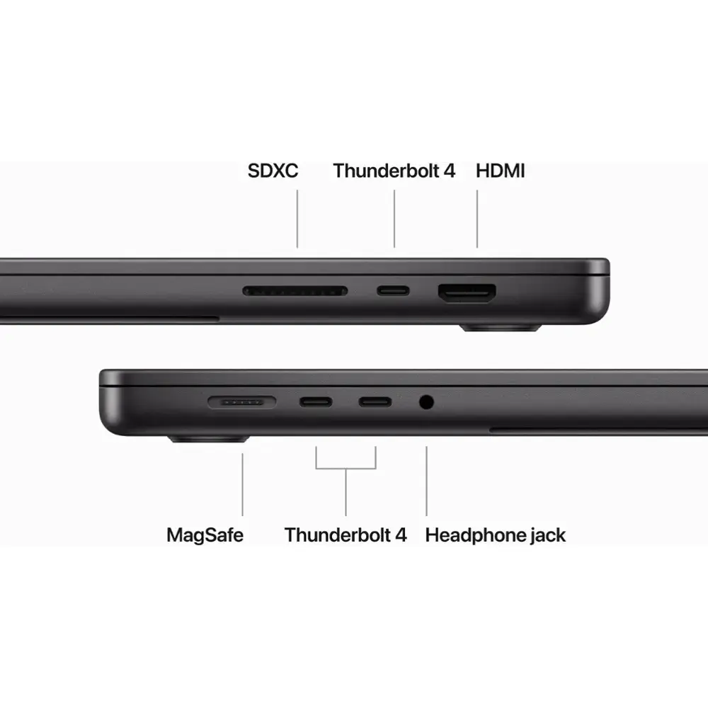 With 48GB RAM and a 1TB SSD, it ensures seamless multitasking and ample storage. Connectivity includes 1 HDMI port, 3 Thunderbolt 4 ports, and a headphone jack. The battery lasts up to 22 hours, and the backlit keyboard, Touch ID, and macOS Sonoma enhance user experience. Its sleek aluminum design in Space Black makes it both stylish and durable.