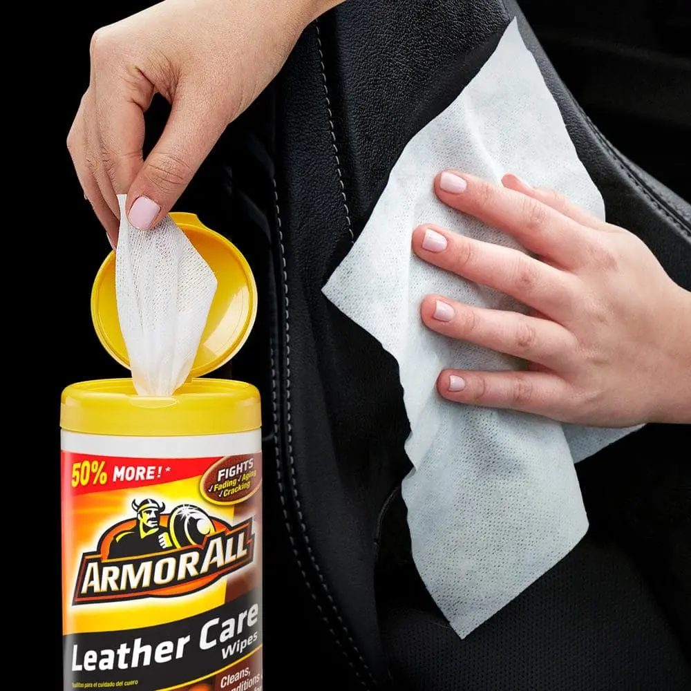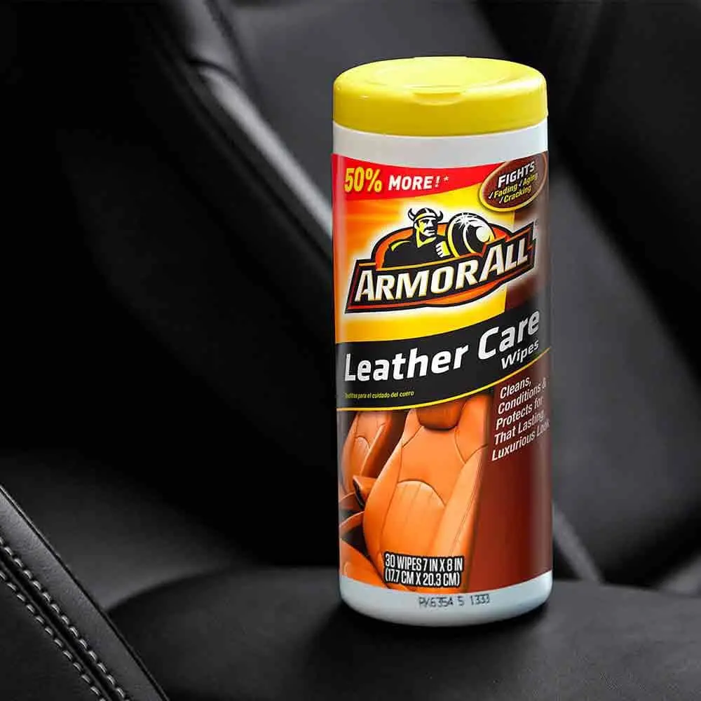 Armor All Leather Care Wipes are designed to help maintain the luxurious look and feel of your car's leather surfaces. These convenient wipes clean, condition, and protect in one easy step. The advanced formula penetrates deep into the leather grain to lift dirt and grime, while conditioning agents restore softness and enhance the leather's natural beauty. Blocking agents provide protection against spills, stains, cracking, fading, and premature aging. Ideal for car interiors, these versatile wipes also work great on handbags, furniture, and luggage. The Moisture Lock Lid keeps wipes fresh for up to one year.