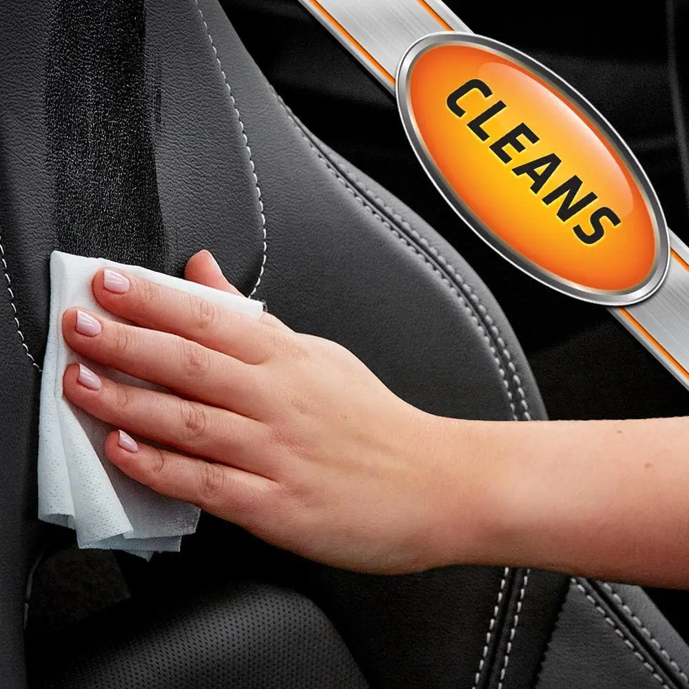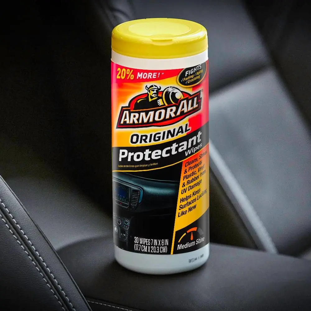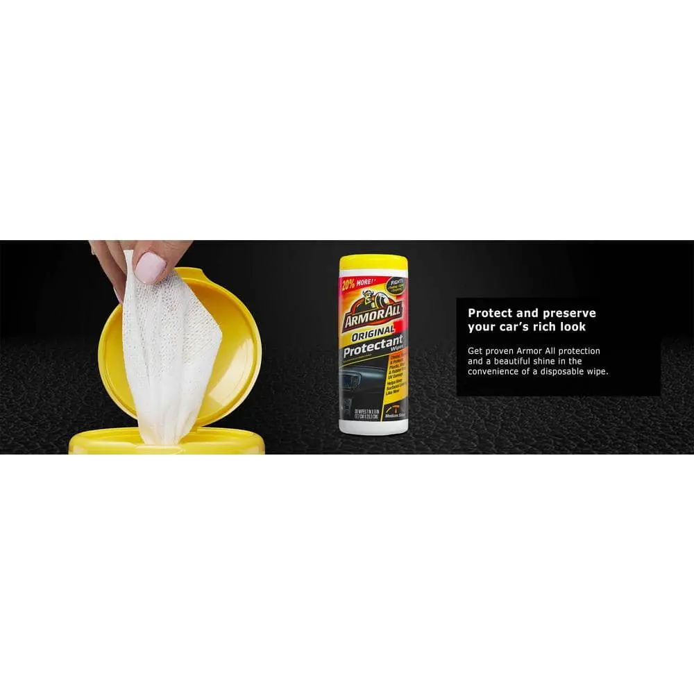 Armor All Original Formula Car Protectant Wipes restore the luster and shine to your vehicle's interior in seconds. These disposable wipes are infused with the same trusted protection found in Armor All Protectant, designed to clean and safeguard your automotive surfaces. With just one swipe, they act as both a dust remover and a protectant, shielding your interior from harmful UV rays. Safe for use on vinyl, rubber, and plastic, these wipes prevent cracking, fading, and discoloration while adding a brilliant shine. Lint-free and non-greasy, they make detailing your dashboard, console, door panels, and vinyl seats a breeze.