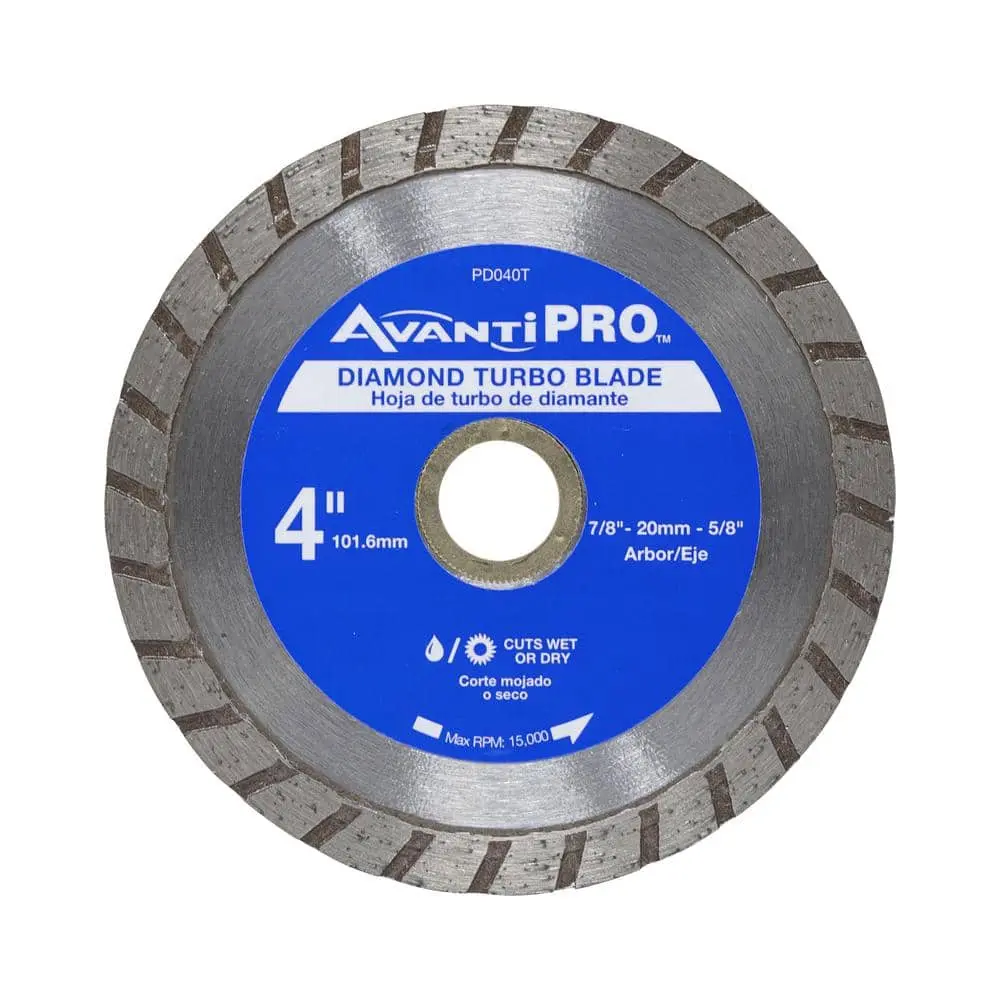 The Avanti Pro 4 in. Turbo Diamond Blade is designed for fast and precise cutting, making it ideal for a variety of materials. Its turbo rim design enhances cutting speed while reducing chipping for a smooth finish. Built with a durable diamond edge, this blade ensures long-lasting performance even with heavy use. Its versatile use allows it to cut through tile, stone, and masonry with ease. Suitable for both dry and wet cutting, it offers flexibility for different cutting applications