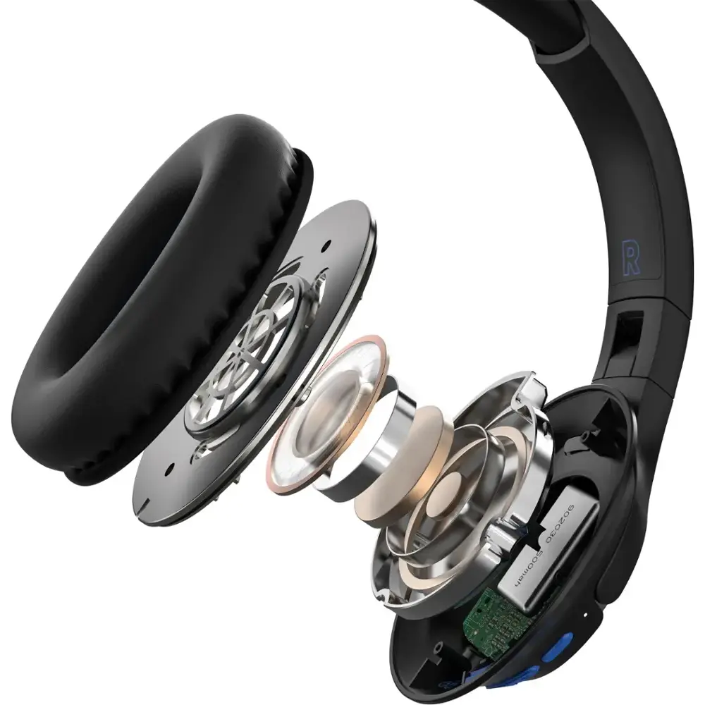 The SoundForm Inspire Wireless Over-Ear Headset for Kids is designed for comfort and safety. With fast USB-C charging, it provides up to 35 hours of playtime on a full charge. Safe Sound technology limits the volume to 85dB, making it ideal for distance learning, travel, or online video streaming. The soft, smaller cushion cups and adjustable headband ensure a perfect fit for kids, while the foldable design allows easy storage in a bag or backpack. RockStar Mode features a second 3.5mm output for audio sharing with friends or classmates. Additionally, the boom mic provides clear sound during lessons, with an indicator light to show when the headset is muted.