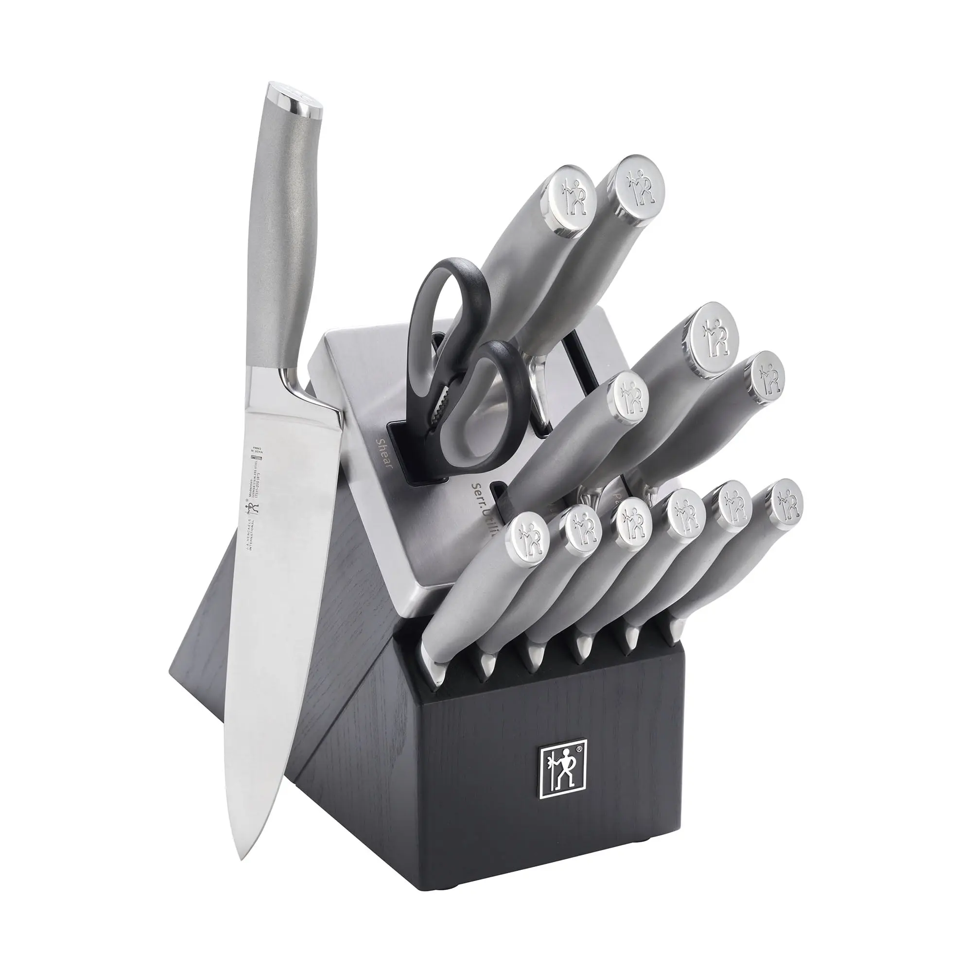 The Modernist cutlery line combines beauty and functionality with a fully forged bolster construction that seamlessly integrates the blade and handle for exceptional durability, balance, and a sleek look. Made from high-quality German stainless steel, the satin-finished blades in this professional knife set deliver precision cuts and are designed to stay sharp over time. The hollow, stainless-steel handles are lightweight and ergonomic, featuring a fingerprint-resistant, sandblasted texture for a comfortable grip. The polished end cap, embossed with the logo, adds a stylish finishing touch.