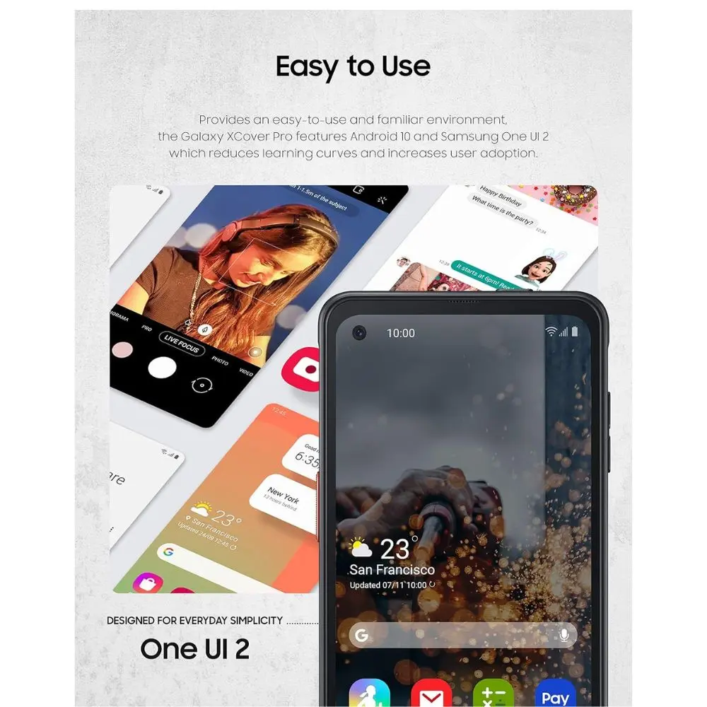The Galaxy XCover Pro provides a familiar and easy-to-use environment, running on Android 10 for seamless operation.
