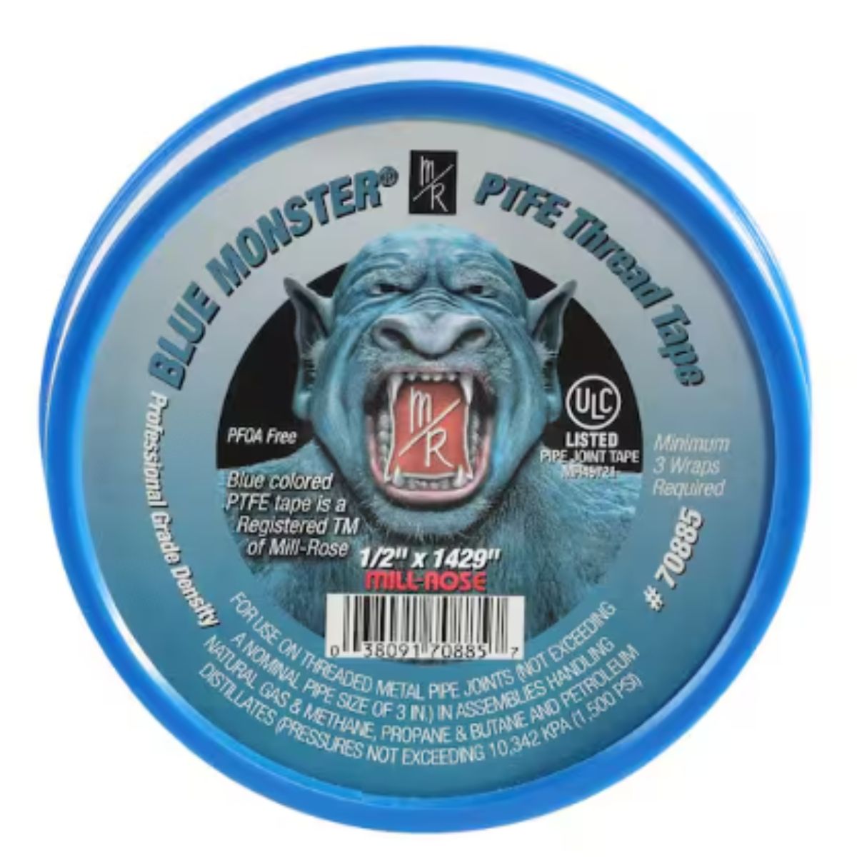 Blue Monster PTFE Thread Seal Tape is a professional-grade sealing tape designed for a multitude of applications, distinguished by its blue color coding and optimal density that strikes a balance between ease of application and effective sealing. Developed by Mill-Rose, it excels in sealing threads made from galvanized steel, iron, brass, copper, aluminum, stainless steel, polyethylene, polypropylene, PVC, CPVC, ABS, fiberglass, and nylon, among others. Suitable for systems carrying a wide range of fluids including water, oils, solvents, gases, and more, Blue Monster is approved for use with potable water and holds UL and ULC certifications for gas applications. It provides reliable performance across diverse temperatures and pressures, ensuring leak-proof joints in plumbing, HVAC, and industrial settings.
