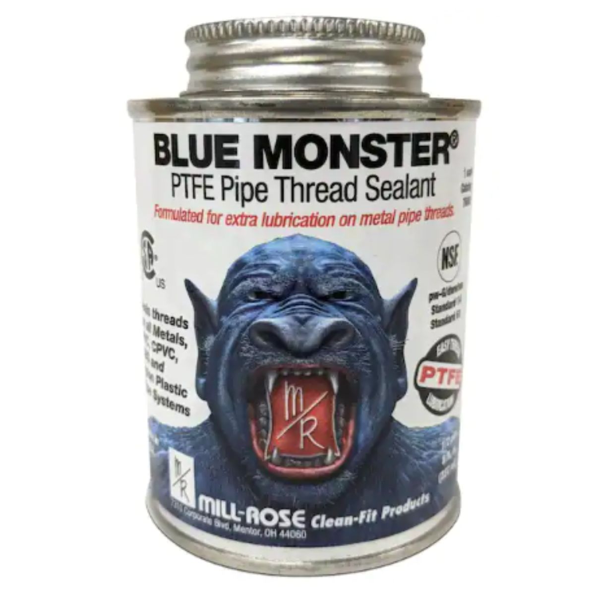 Blue Monster Industrial Grade PTFE enriched pipe thread compound sets itself apart as a slow-drying, soft-setting, and non-hardening solution designed for a wide array of pipe thread sealing applications. With its high-bulk density and enriched PTFE formulation, Blue Monster excels in filling voids and ensuring reliable sealing under varying pipe tolerances and conditions. It's ideal for both on-site and assembly line operations, offering immediate pressurization without requiring curing time. This compound is lead-free, non-toxic, and remains stable in the can without hardening or separation. It effectively seals threads on metals, PVC, CPVC, ABS, and nylon pipe systems, providing extra lubrication for metal threaded connections. Blue Monster is suitable for applications involving potable water and holds approvals from CSA for gas use, as well as NSF certifications 14 and 61.