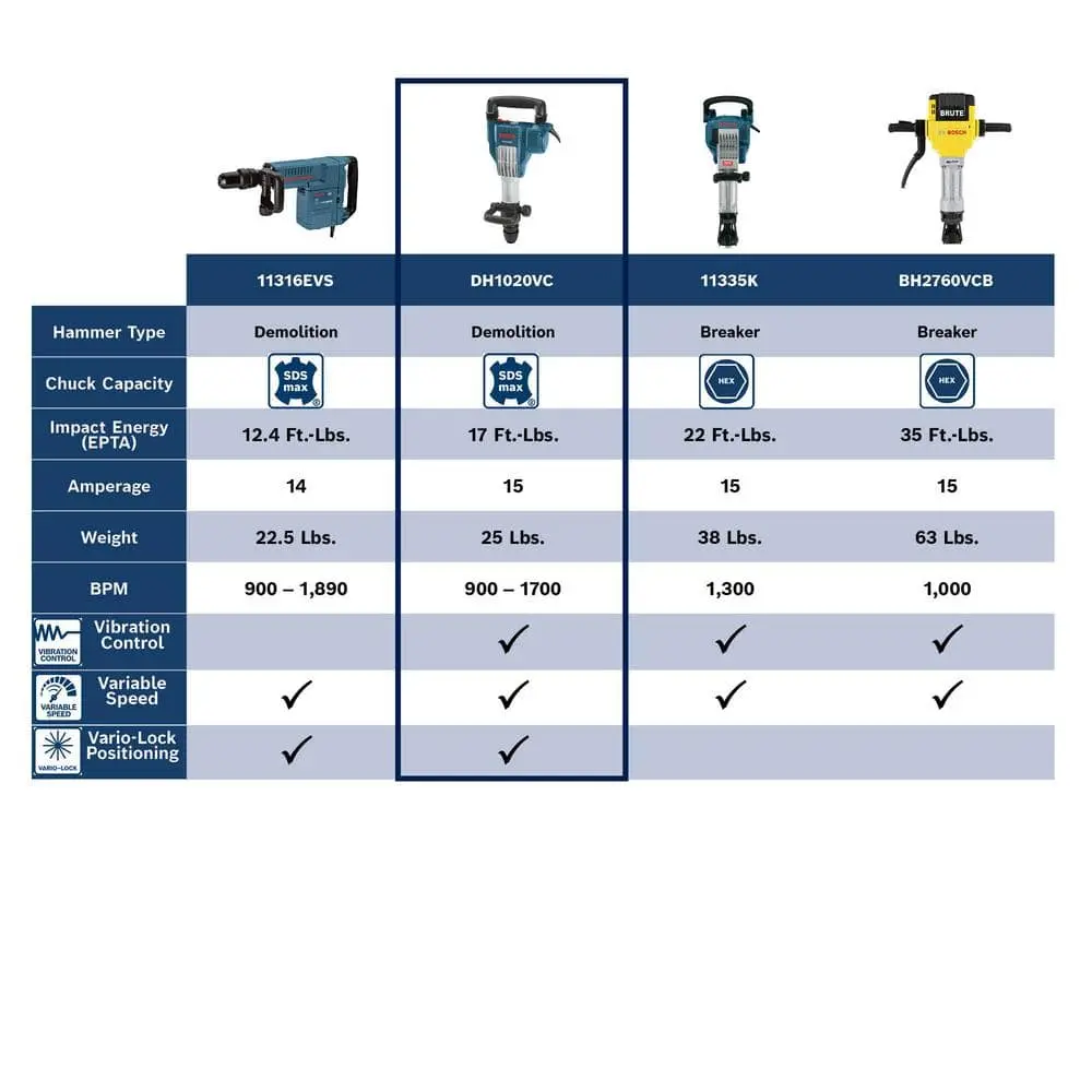 Bosch’s 15 Amp Demolition Hammer delivers powerful impact energy with advanced anti-vibration features. Designed for chipping through concrete or tile with 17 ft. lbs. of force, this tool offers variable speed and impact settings to suit different tasks. Its built-in harmonic absorber reduces vibrations, enhancing user comfort for longer work sessions. The tool’s sleek, inline design optimizes weight distribution, making it ideal for both vertical and light-duty horizontal tasks. The 12 vario-lock positions (in 30° increments) allow for customizable chisel angles (chisel sold separately).