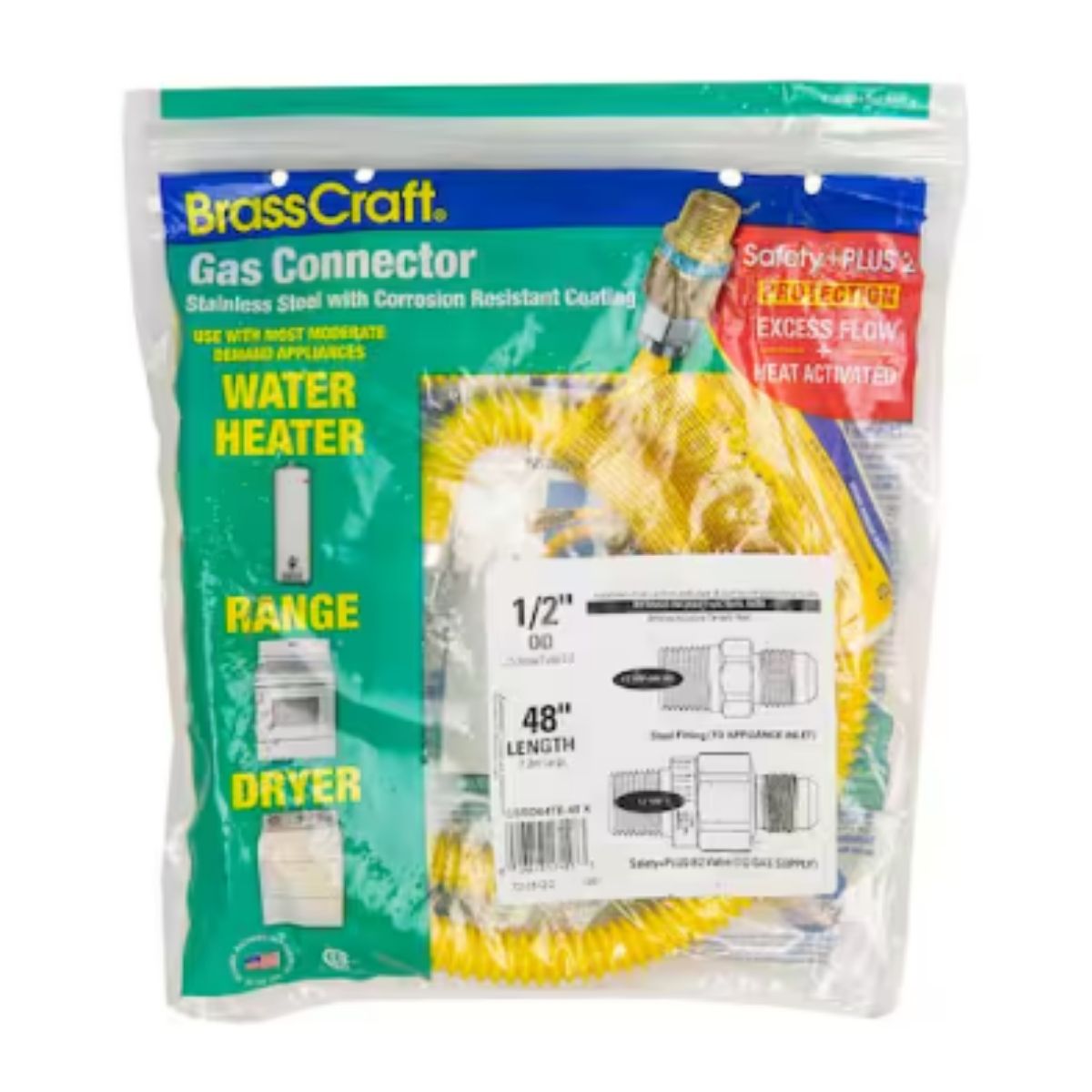 BrassCraft's Safety+PLUS2 gas connector integrates excess flow technology and thermal heat activation for safety. It includes an excess flow valve (EFV) to limit gas flow in case of a rupture, a thermal ring to restrict flow at high temperatures, and a ProCoat polymer coating for corrosion resistance. This connector offers enhanced safety and durability for your home's gas supply.