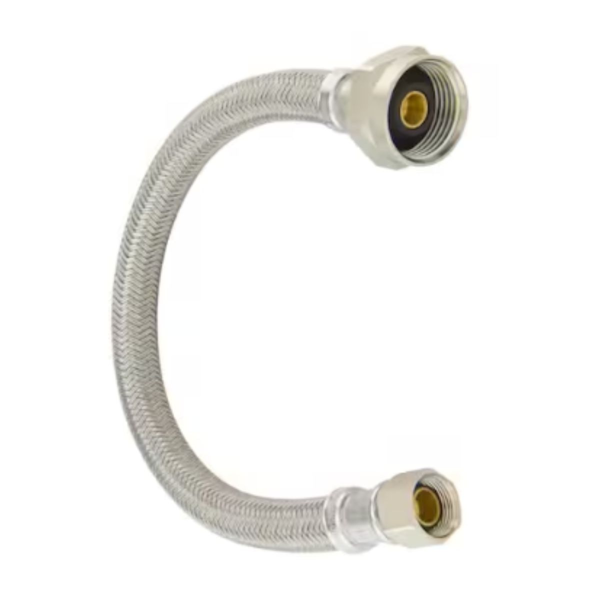 The BrassCraft Speedi Plumb PLUS water connector, with a 3/8 in. Flare inlet and 7/8 in. Ballcock outlet, is corrosion-resistant inside and out. It connects the water supply to your toilet, featuring a high-tenacity yarn protected by polymer coating for durability. Its tough PVC tubing resists chlorine and other corrosive elements. The braided polymer fibers bend freely without kinking or crimping.