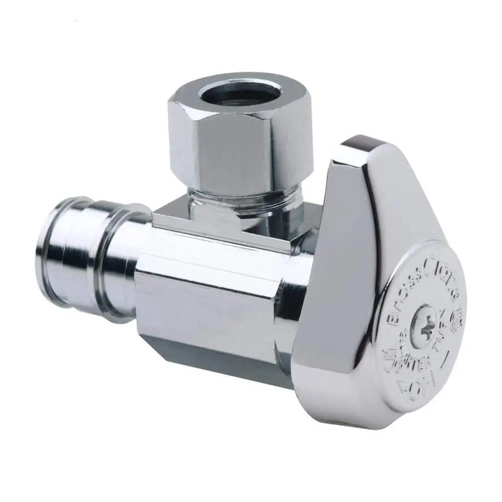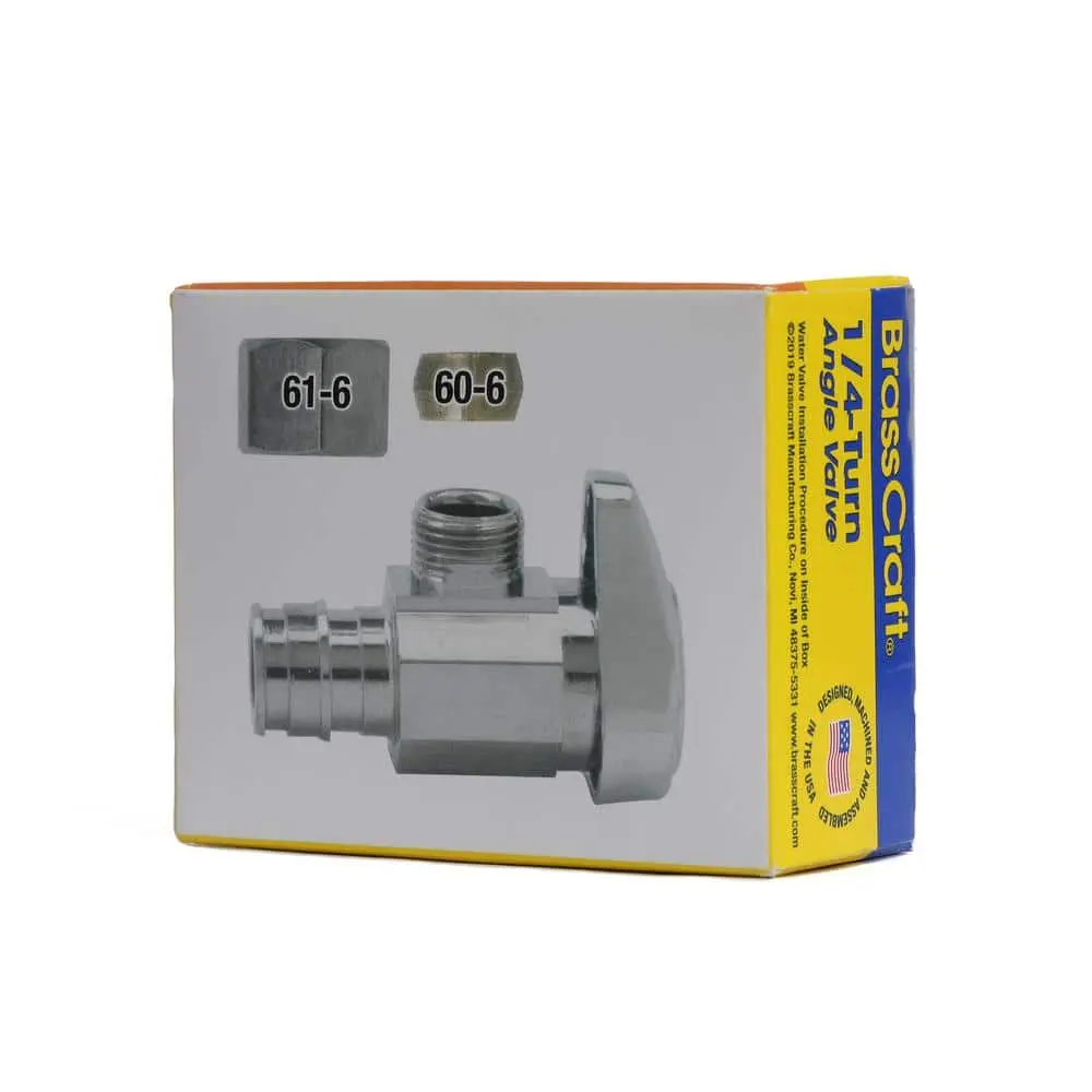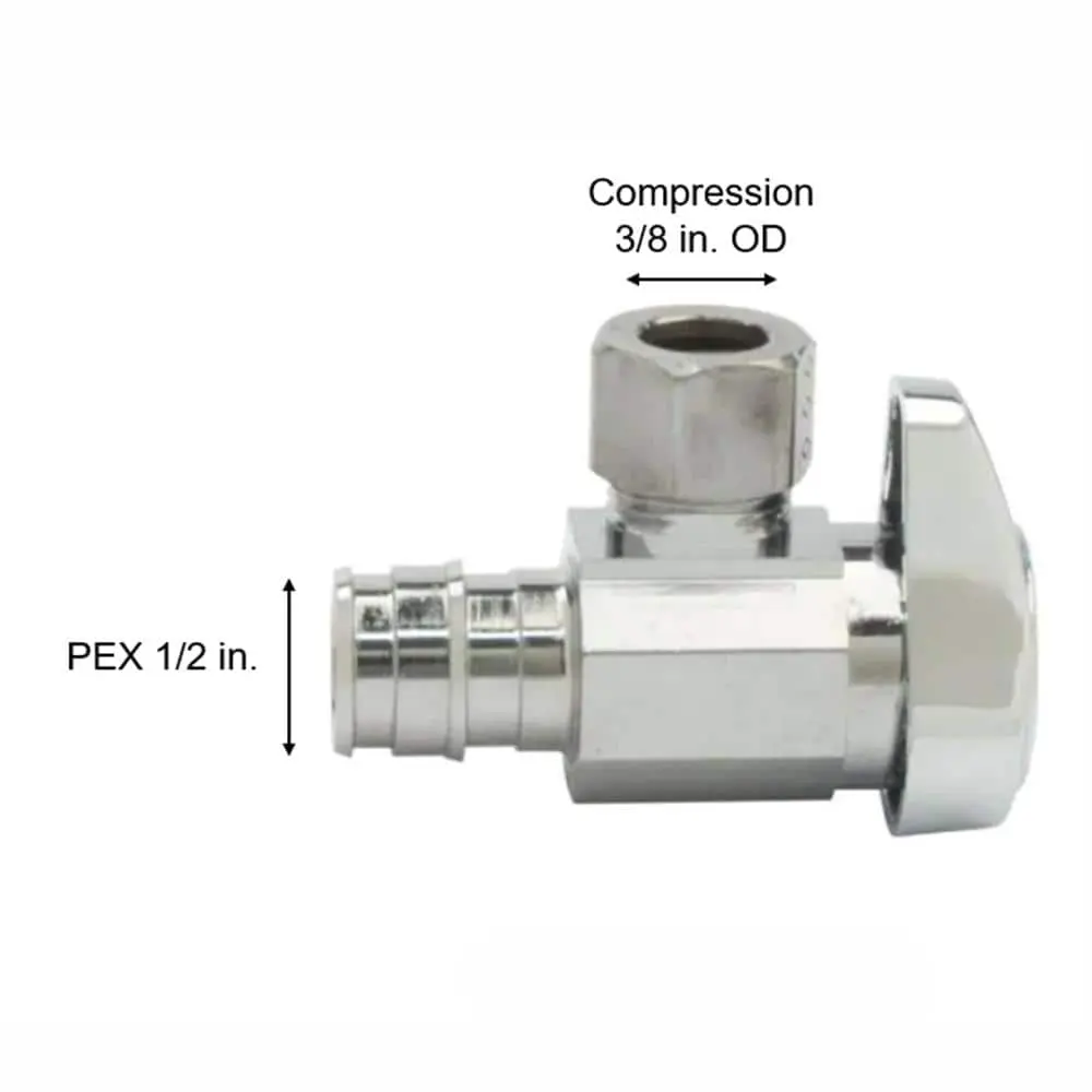 The BrassCraft 1/2 in. Nom Cold Expansion PEX Barb Inlet x 3/8 in. OD Compression Outlet 1/4-Turn Angle Valve provides precise water flow control for household plumbing fixtures, including faucets, toilets, dishwashers, icemakers, and washing machines. Typically installed where the water pipe enters from the wall, this valve allows for quick shut-off with a simple 90° turn of the handle, enabling maintenance or repairs without shutting off the entire home’s water supply.