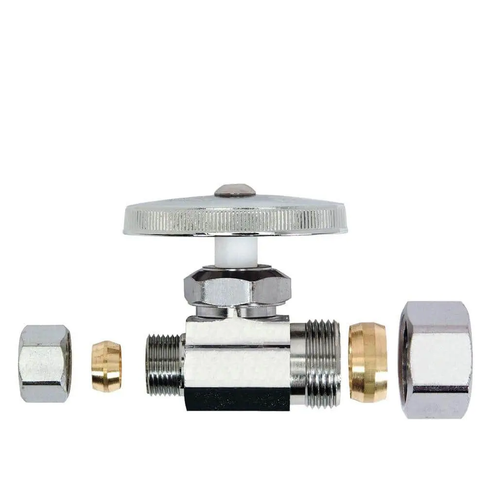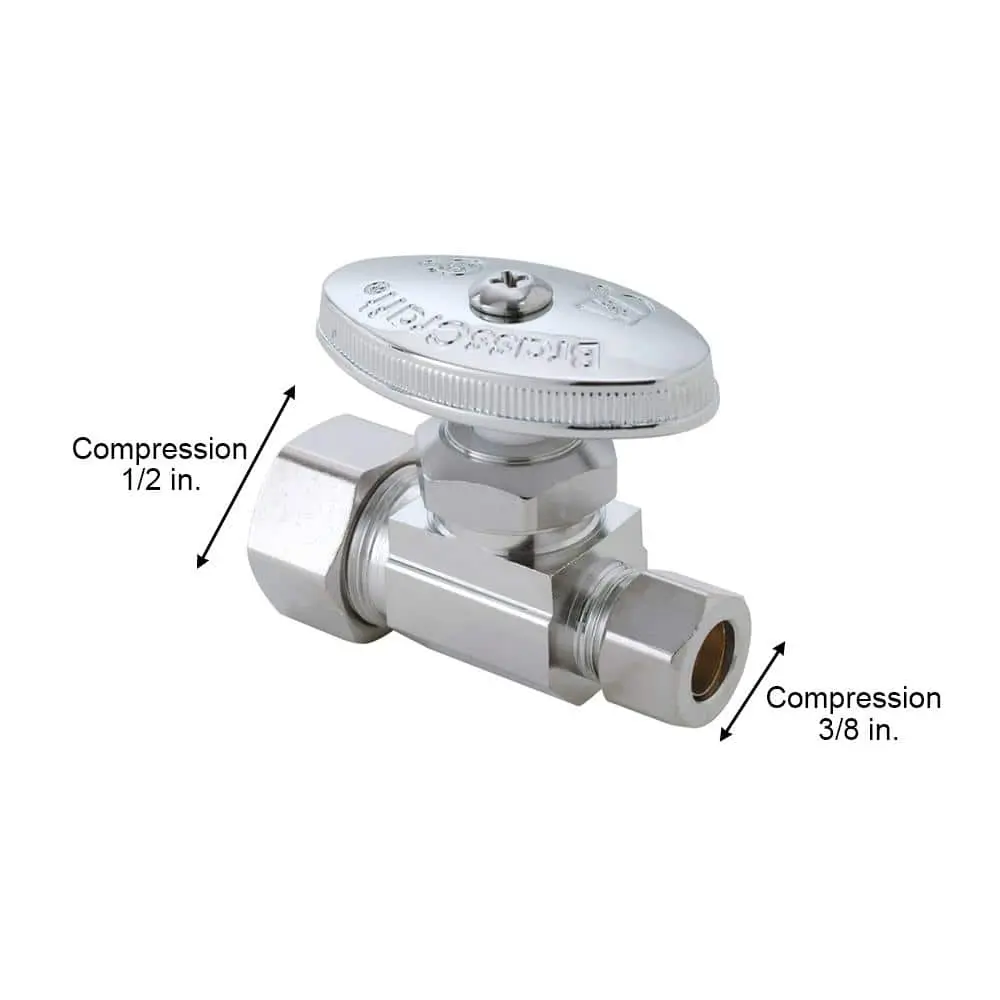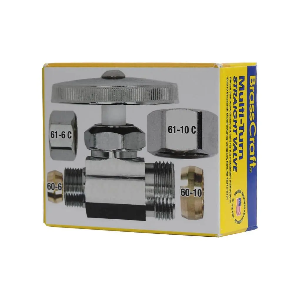 The BrassCraft 1/2 in. Nominal Compression Inlet x 3/8 in. O.D. Compression Outlet Multi-Turn Straight Valve is ideal for installations where the water pipe enters from the floor. Its multi-turn handle allows you to easily shut off water flow to a specific plumbing fixture for maintenance or repairs without disrupting water supply to the entire home. Designed for use with faucets, toilets, dishwashers, icemakers, washing machines, and more.