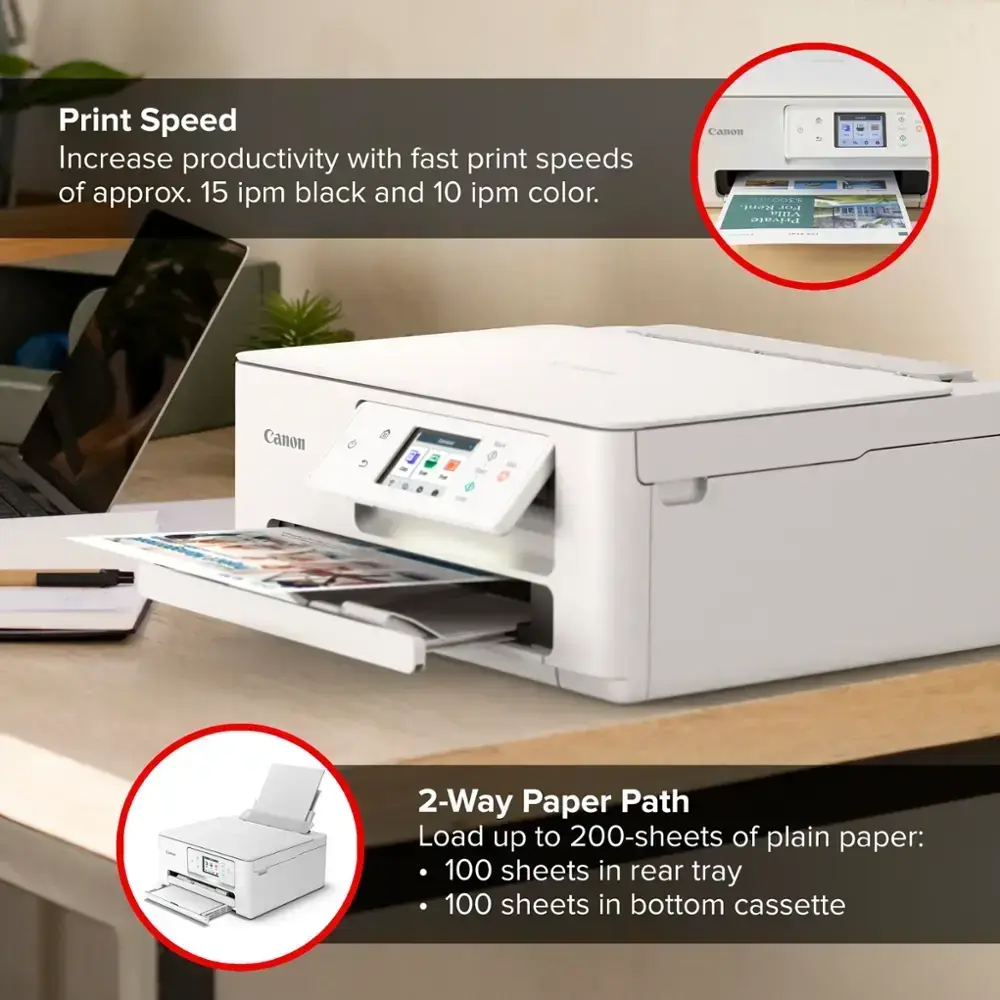 The Canon PIXMA TS7720 Wireless All-In-One Inkjet Printer is a versatile and efficient solution for home or office use. It offers all-in-one functionality, allowing you to print, scan, and copy with ease. With wireless connectivity, you can conveniently print from your smartphone, tablet, or computer without the need for cables. This printer delivers high-quality prints, producing sharp text and vibrant photos every time. Its compact and stylish design in a sleek white finish makes it a perfect fit for any workspace. The 2.7" color touchscreen provides a user-friendly interface for simple operation, while the auto document feeder streamlines multi-page scanning and copying tasks. Plus, it supports mobile printing with Apple AirPrint and Mopria Print Service, adding to its convenience and flexibility