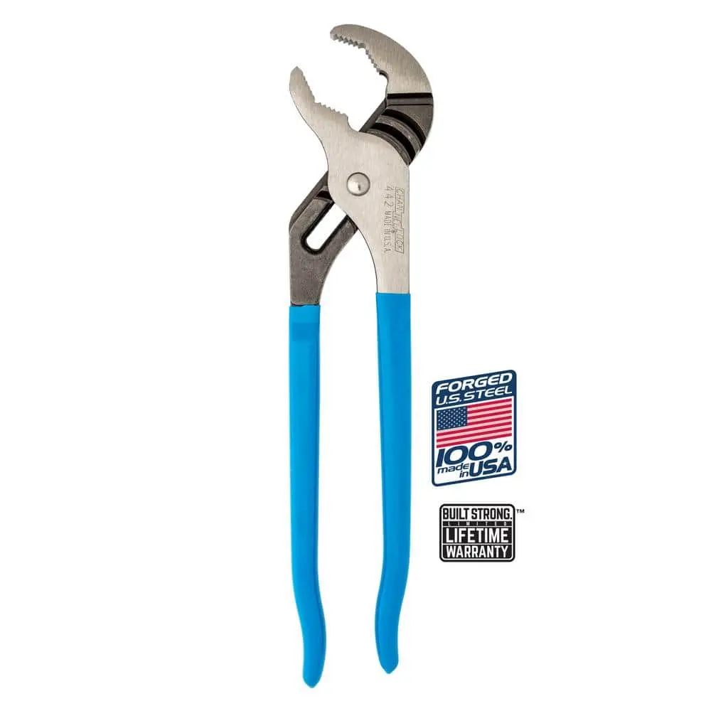 CHANNELLOCK 442 12" Tongue & Groove Pliers feature a unique v-jaw design that creates more points of contact on round stock and tubing. These pliers are built to last with a PERMALOCK fastener to eliminate nut and bolt failure, a patented reinforcing edge to minimize stress breakage, and laser-hardened teeth for a superior, longer-lasting grip. CHANNELLOCK V-JAW Pliers are made in the USA and forged from high carbon U.S. steel that is specially coated for ultimate rust prevention