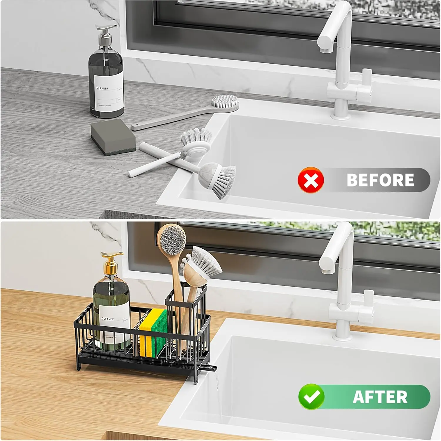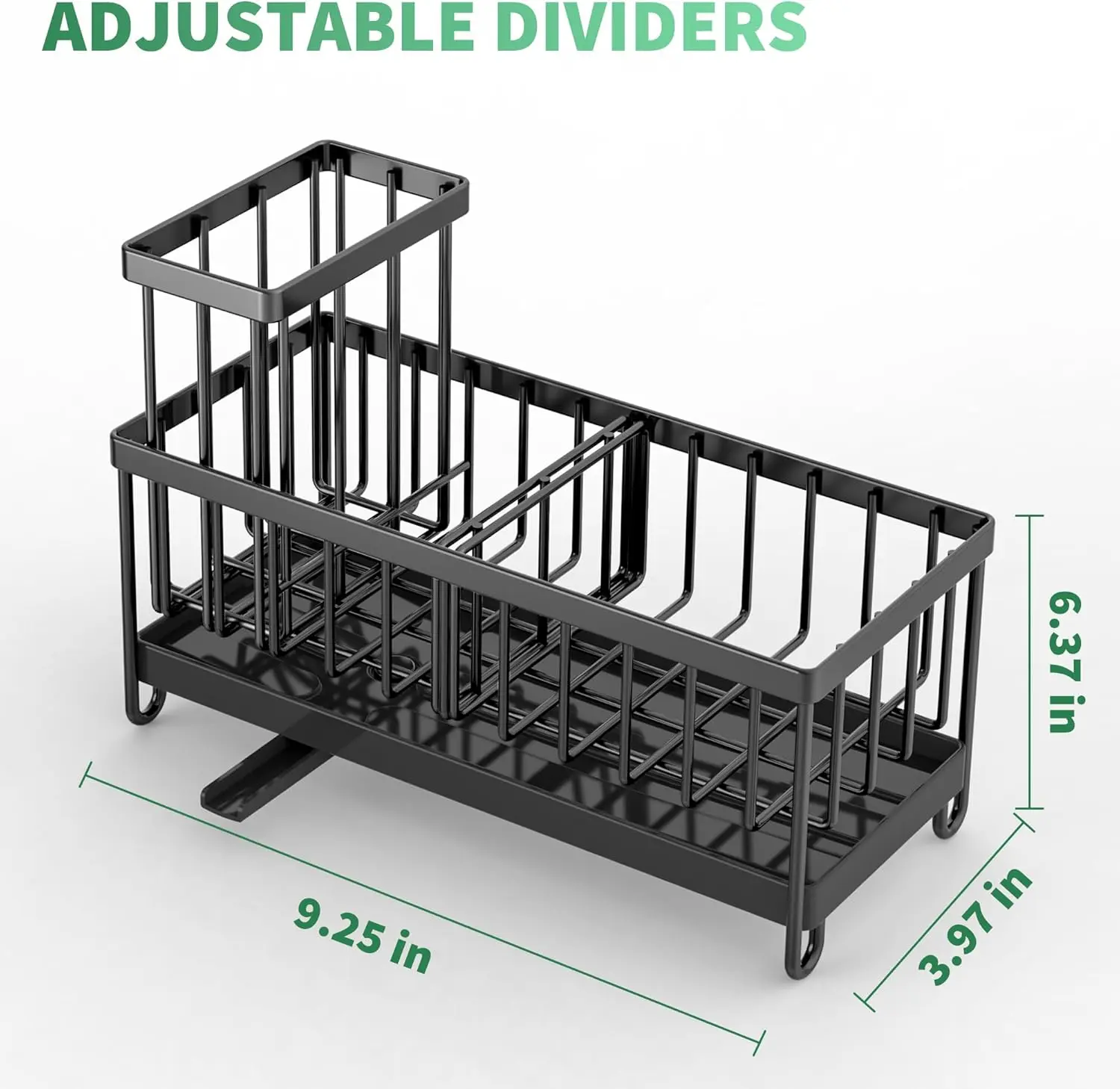 Rotatable SpoutThe Cisily kitchen sink caddy features a rotatable spout that swivels in three directions, directing sponge water into the sink and reducing countertop mess. This minimizes the need to frequently clean the drip tray, saving you time.Compact DesignMeasuring just 9.25" x 3.97" x 6.37", this sponge holder is perfect for small kitchens. It accommodates a detergent bottle, sponge ball, and sink stopper, along with an upgraded brush holder for up to four brushes, maximizing countertop space.Durable MaterialCrafted from premium stainless steel, this sink organizer resists rust and deformation. Its easy to cleansimply rinse it under running water to declutter your counters.Thoughtful Divider DesignThe ergonomic divider creates three separate storage spaces, allowing for organized placement of different items and optimizing space for a neater kitchen.Satisfaction GuaranteedThe Cisily kitchen sink organizer is ready to use right out of the boxno installation needed. Ideal for counters or bathrooms, it makes a thoughtful gift. For any questions, our customer service team is here to help.
