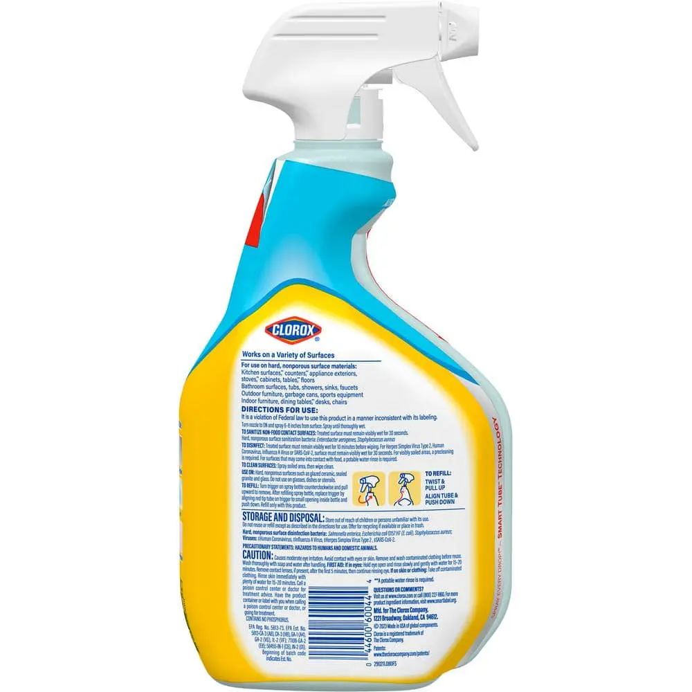 Clorox Disinfecting All Purpose Cleaner is designed to tackle everyday messes like grease, grime, and food stains on a variety of hard, nonporous surfaces such as kitchen sinks, counters, tubs, toilets, and more. This bleach-free cleaner leaves behind a refreshing Crisp Lemon scent without the harsh odor of bleach. It effectively kills 99.9% of bacteria and viruses, and helps prevent the growth of bacteria for up to 24 hours on non-food contact surfaces. Perfect for cleaning tough dirt, fingerprints, soap scum, and sticky messes, Clorox provides a long-lasting, fresh clean with confidence.