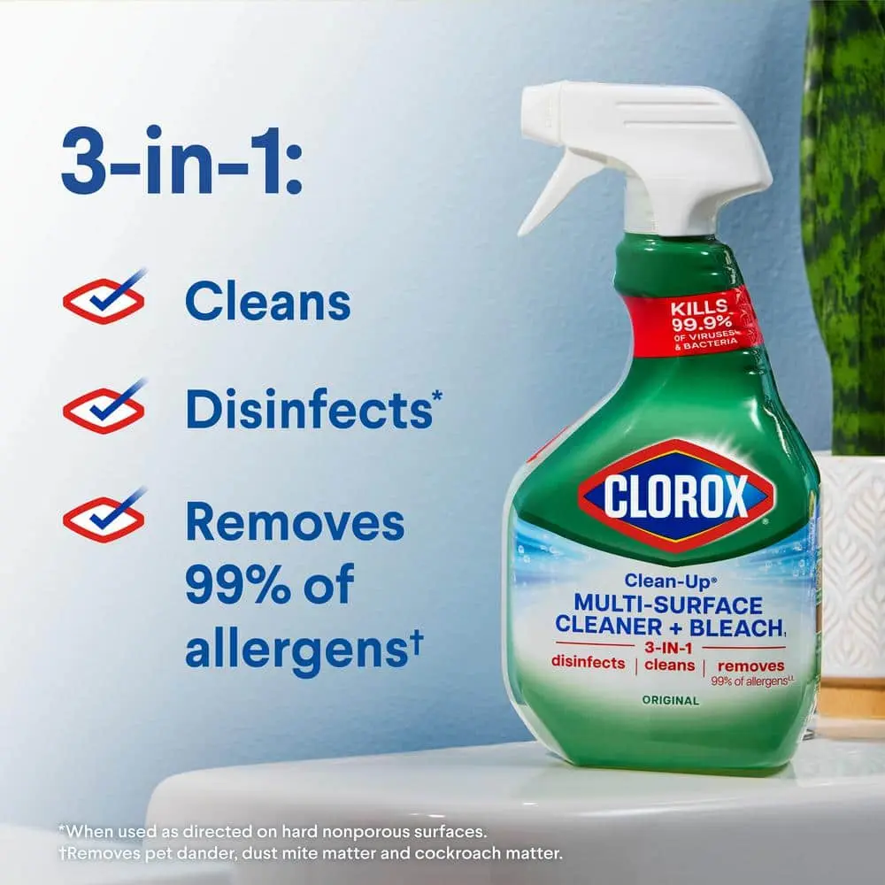 Clorox Clean-Up Multi-Surface Cleaner with Bleach is a 3-in-1 cleaner that disinfects, cleans, and removes 99% of allergens. It tackles tough stains, dirt, and grease without scrubbing, while also killing 99.9% of bacteria and viruses. Safe for various surfaces like stainless steel, granite, and fiberglass, it’s perfect for cleaning floors, countertops, and bathroom areas. This product is designed for refill use with a 32 oz spray bottle.