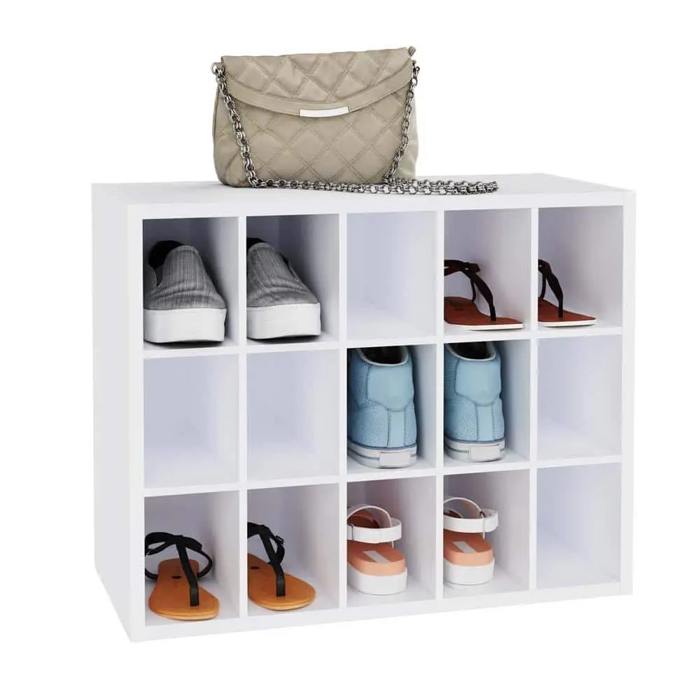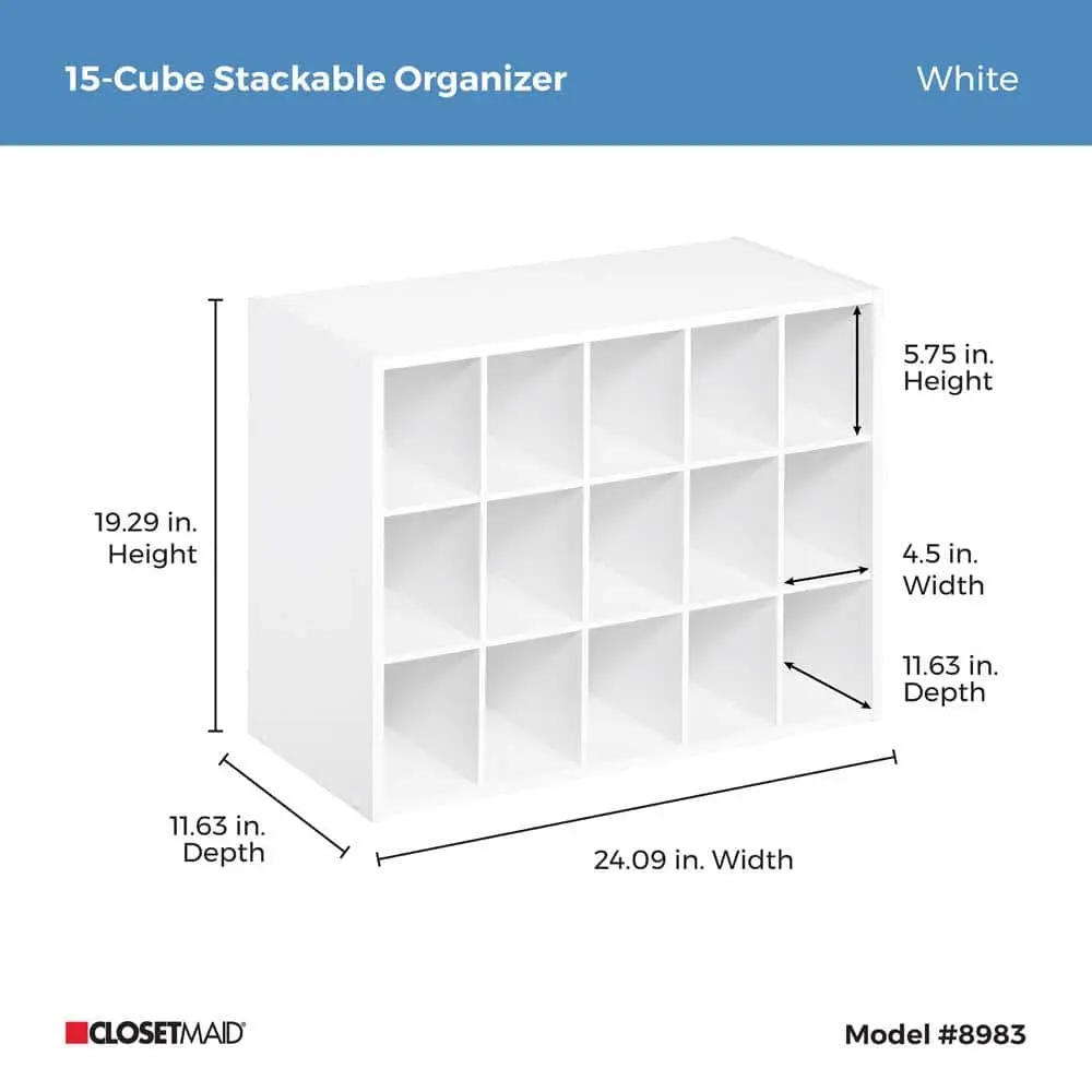 The ClosetMaid 19 in. H x 24 in. W x 12 in. D White Wood Look 15-Cube Storage Organizer is designed with a compact 19 in. H x 24 in. W x 12 in. D dimension, making it ideal for various storage needs. Its 15-cube design offers multiple compartments to keep your items organized. The stylish wood-look finish adds a modern touch to any room, while the durable construction ensures long-lasting use. This organizer is designed for easy assembly, allowing you to set it up quickly. Its versatile use makes it perfect for storing toys, books, office supplies, and more