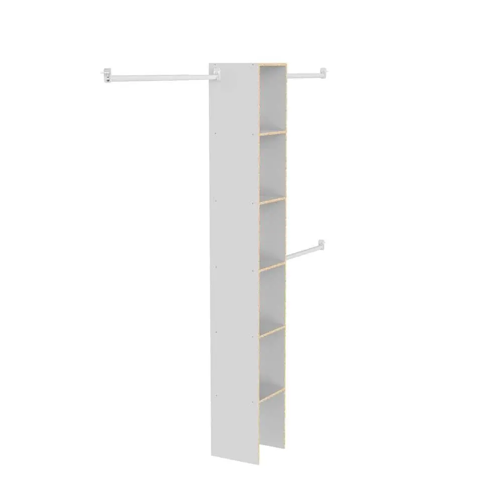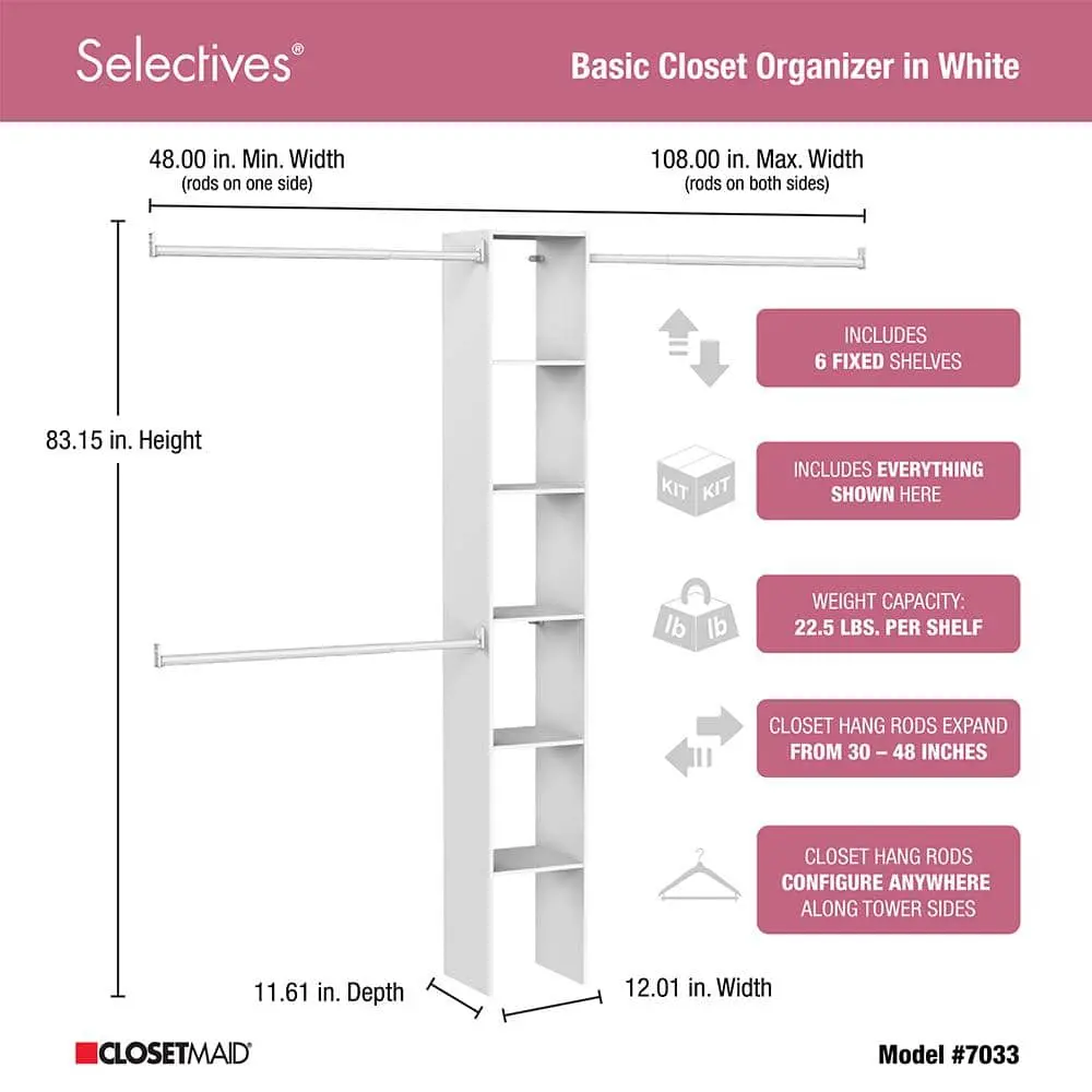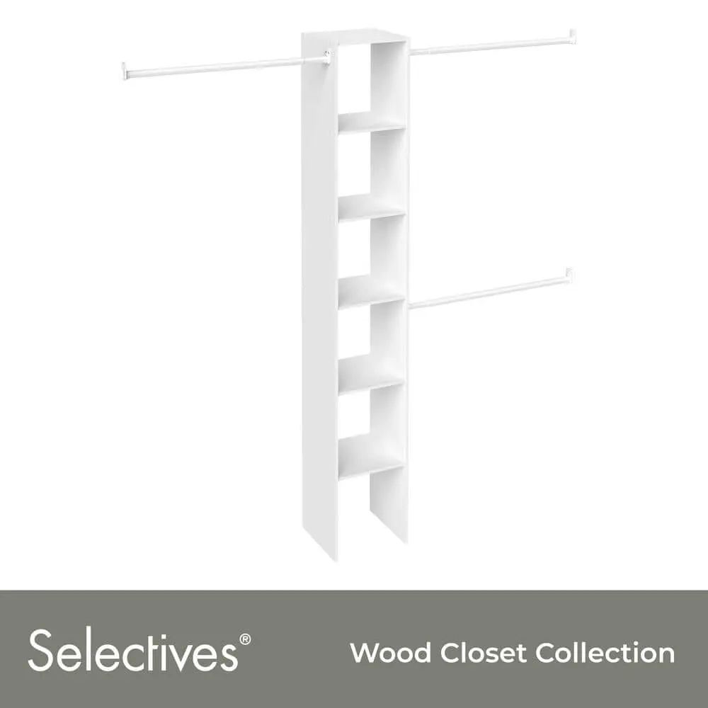 The ClosetMaid Selectives 12 in. W White Custom Tower Wall Mount 6-Shelf Wood Closet System is designed to optimize storage while maintaining a sleek and functional look. Its 12 in. width makes it perfect for compact spaces, while the 6 adjustable shelves provide customizable storage to meet your needs. Built with durable wood construction, this tower ensures long-lasting performance, and its wall-mountable design saves space while offering easy installation. The sleek white finish adds a modern touch, making it an excellent choice for organizing clothes, accessories, and more in closets, garages, or any other space