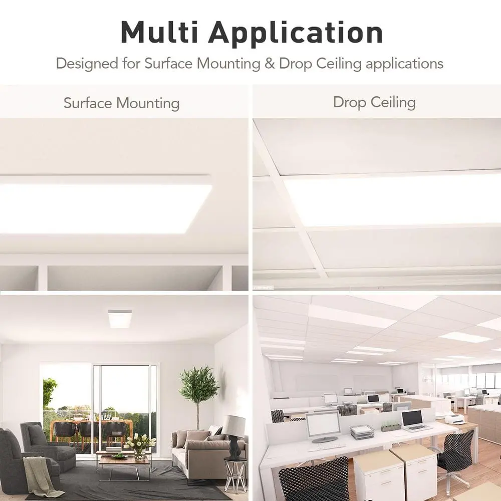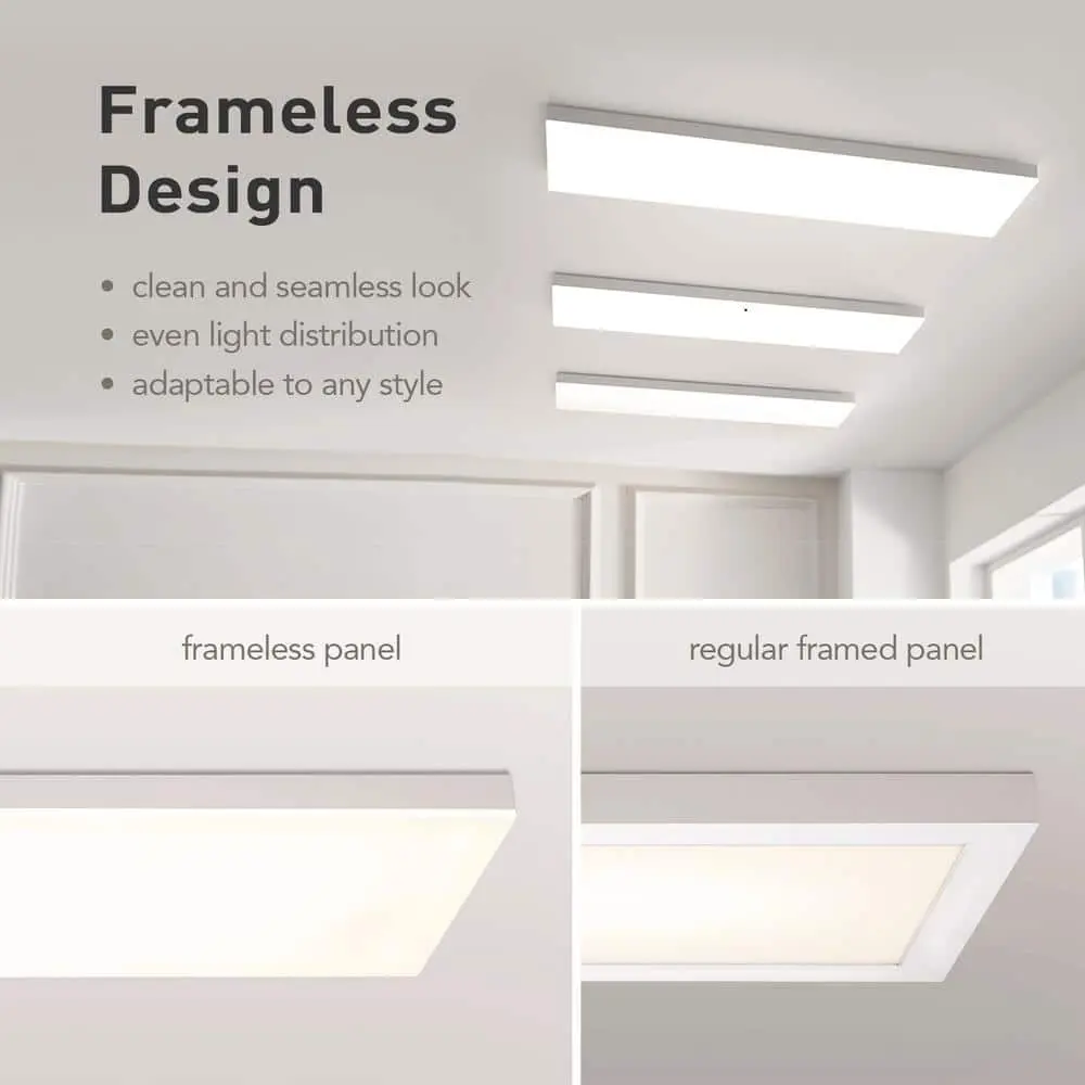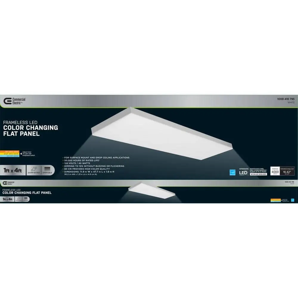 The Commercial Electric Frameless Integrated LED Color Temperature Select Flat Panel Light is designed for both surface mount and drop ceiling applications. With the simple flick of a button, you can adjust the color temperature to fit your needs. The integrated color-changing switch allows you to choose between 3000K (relaxing), 4000K (everyday use), or 5000K (task lighting). ENERGY STAR certified, IC rated, and integrated with LED technology, this light offers long-lasting performance without overheating. It has an impressive 50,000-hour lifespan—about 34 years if used 4 hours a day.