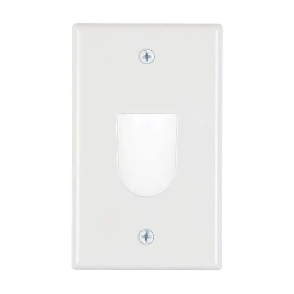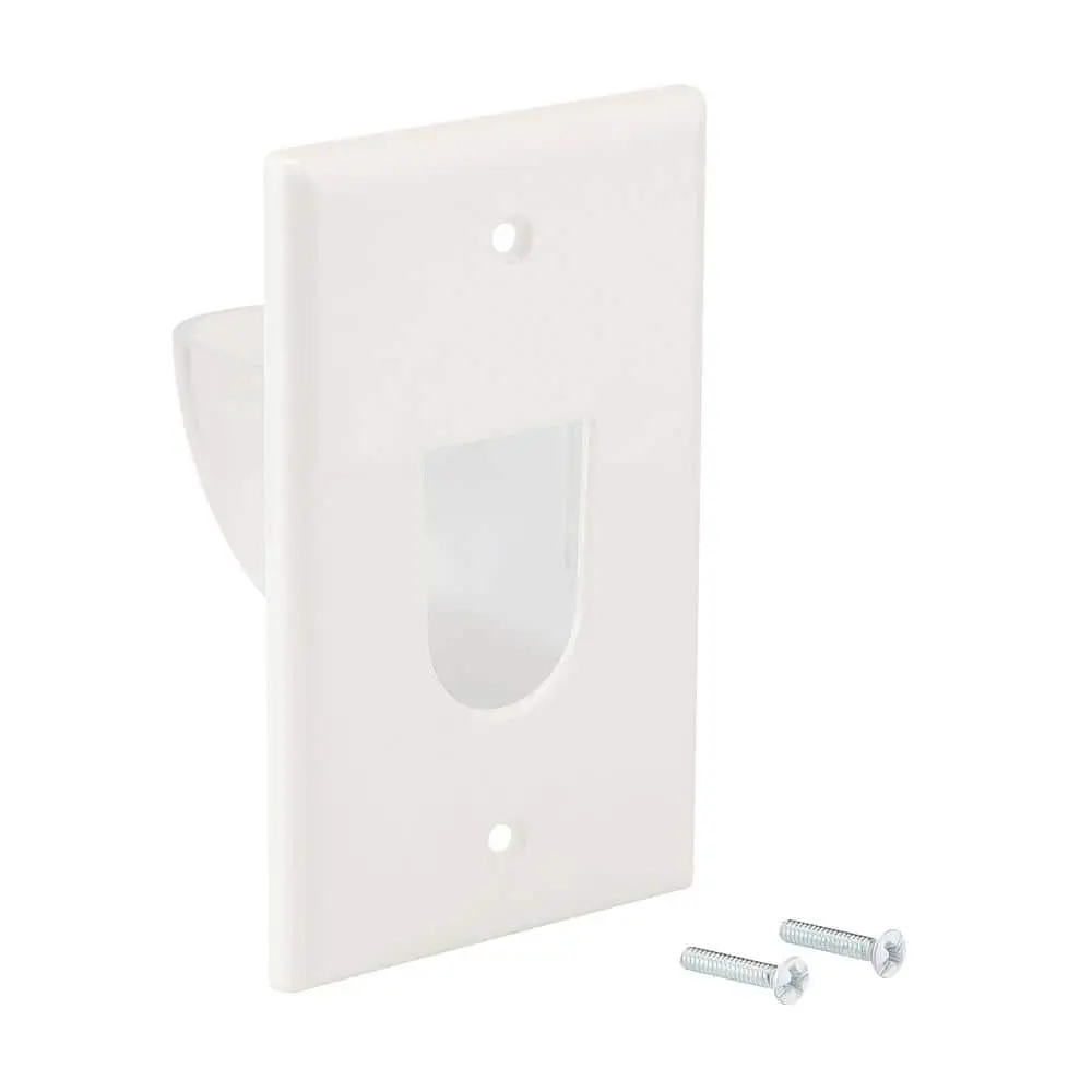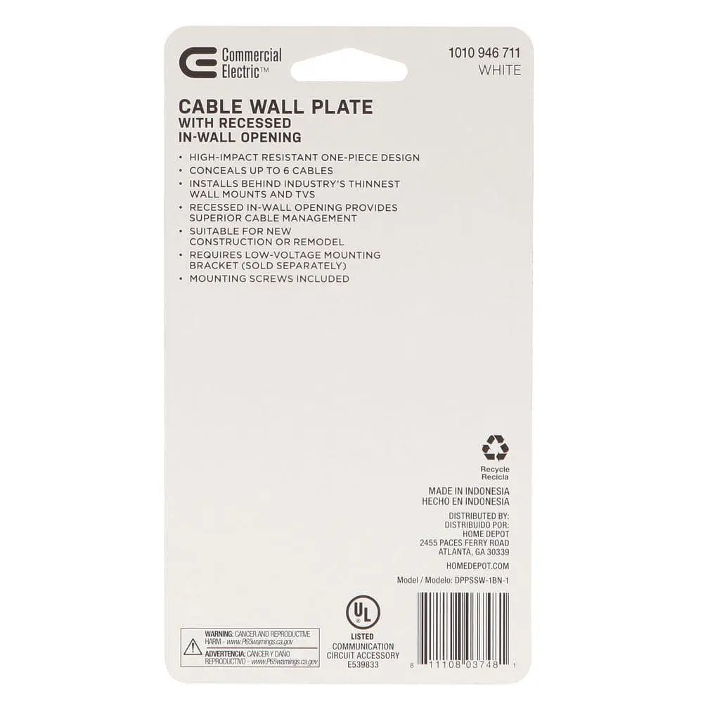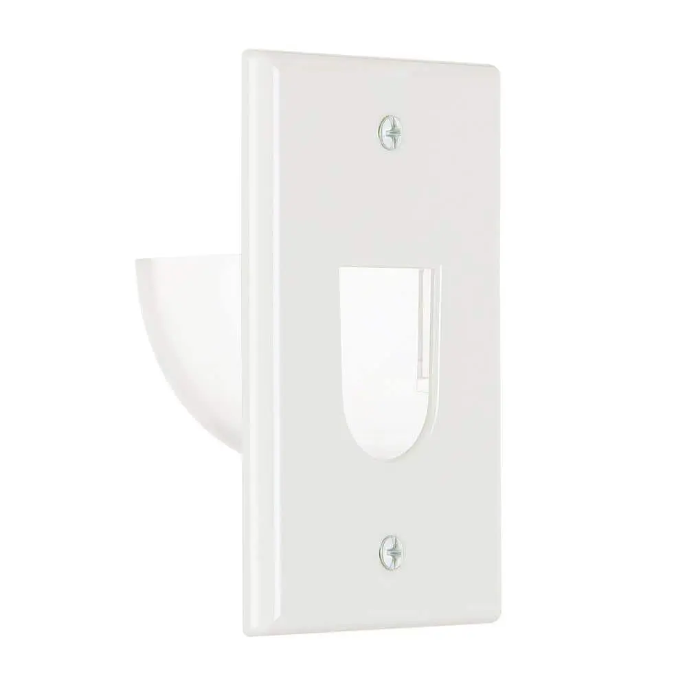 The Commercial Electric 1-Gang Recessed Cable Wall Plate is designed to conceal low-voltage cables within the wall, providing a sleek and organized way to manage cables for multi-media devices. Featuring a recessed bullnose, it can be installed with the opening facing up or down, ensuring a seamless transition between the wall and the plate. This design not only guides cables effectively but also helps maintain a clutter-free, clean appearance for any multimedia setup.