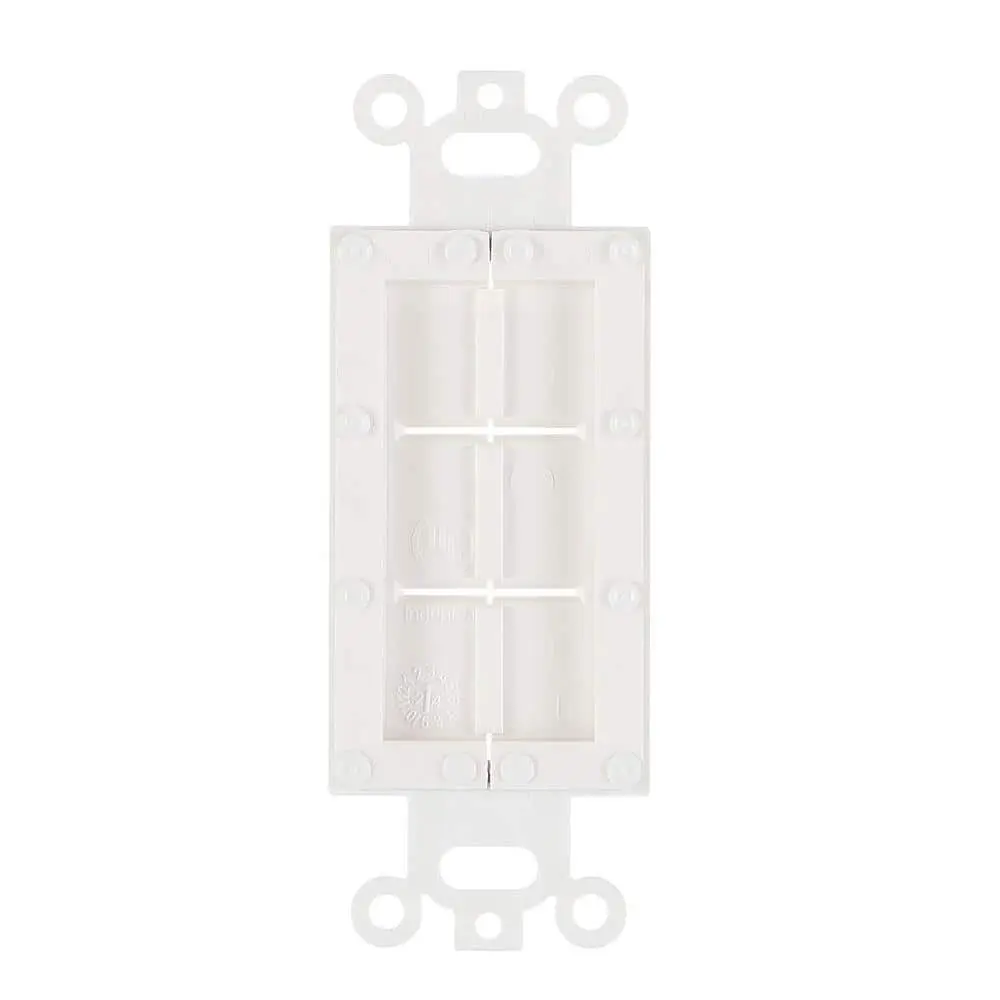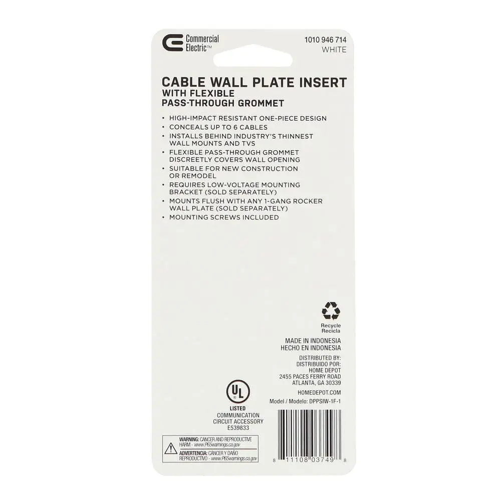 The Commercial Electric 1-gang flexible opening cable wall plate insert is designed for use with any 1-gang rocker opening. It offers an efficient and discreet solution for managing low-voltage cables within the wall, ensuring a clean, organized setup for multimedia connections. Installation requires a low-voltage mounting bracket and a compatible wall plate with at least one rocker opening (both sold separately). Featuring a patented, energy-efficient flexible pass-through grommet, it helps minimize air loss while delivering excellent cable management. This insert keeps cables neatly hidden, enhancing the appearance of any multimedia setup.