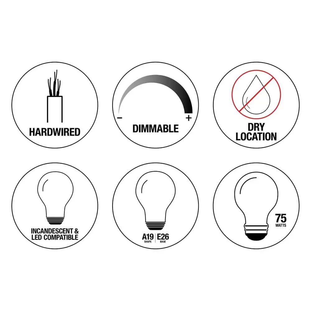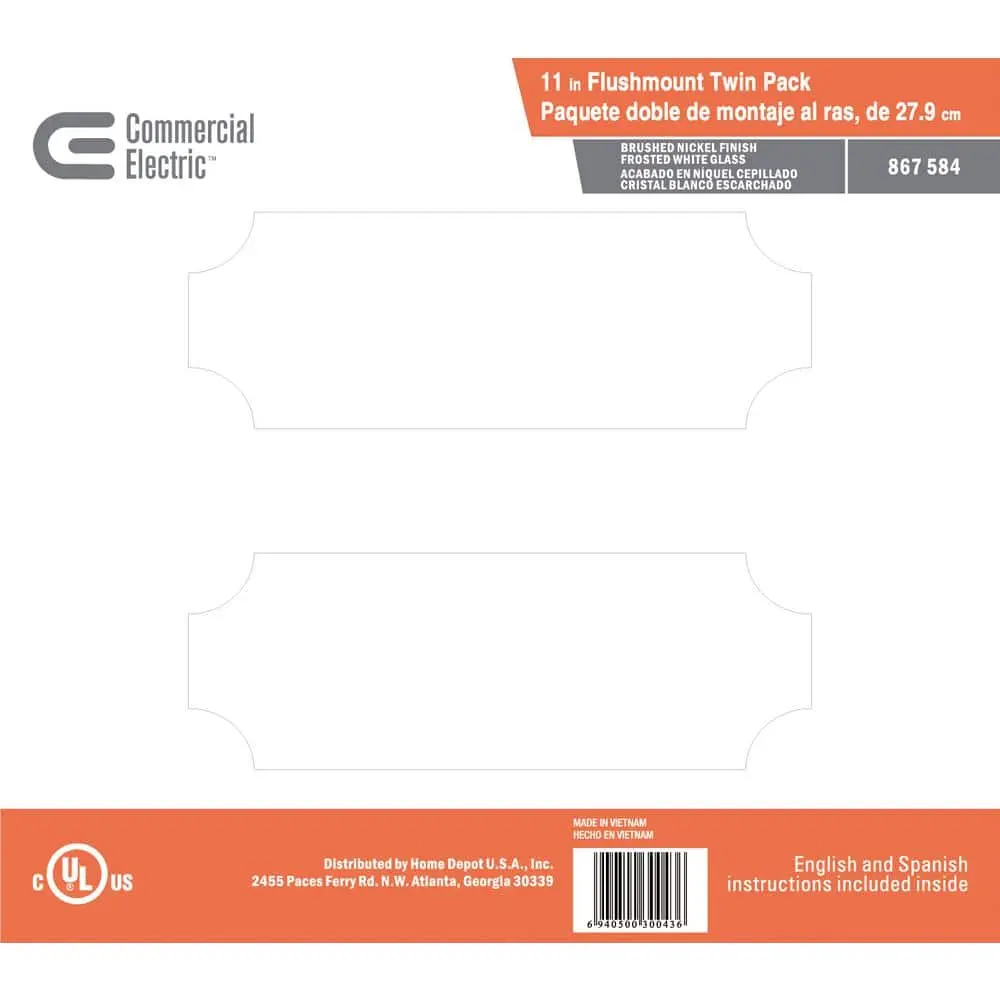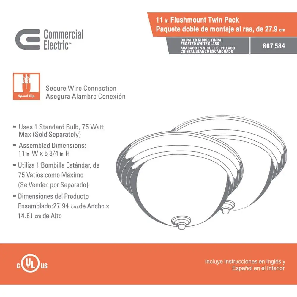 Simplify your lighting installation with this Flushmount 2-Pack from Commercial Electric. Featuring a sleek brushed nickel finish, these ceiling fixtures offer a modern look. The frosted glass lens softens the light for a pleasant illumination. Each fixture includes all necessary assembly and installation components, including shade, hex nut, nipple, bottom cover, finial, speed wire clips, outlet box screws, mounting strap, ground screw, and mounting screws. Compatible with 75-Watt max medium-base bulbs or 19-Watt max CFLs (sold separately). Pack includes 2 fixtures. UL-listed.