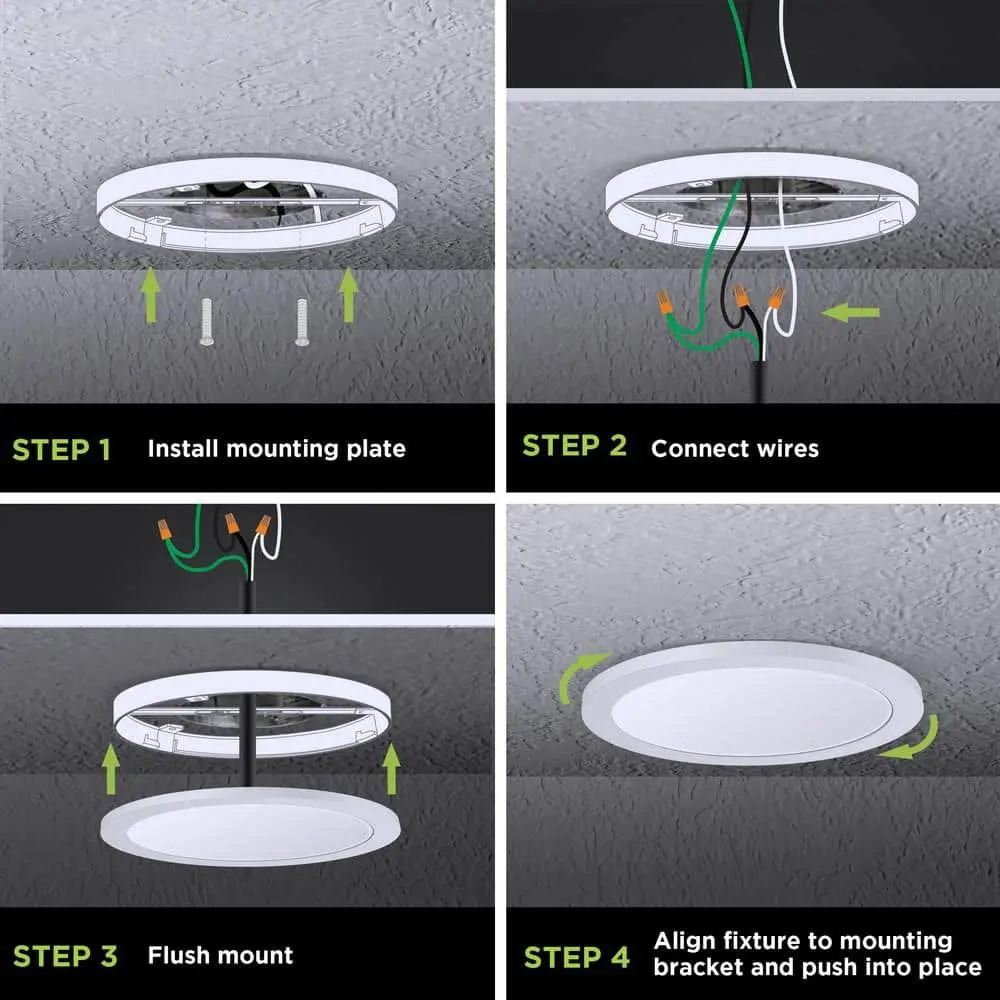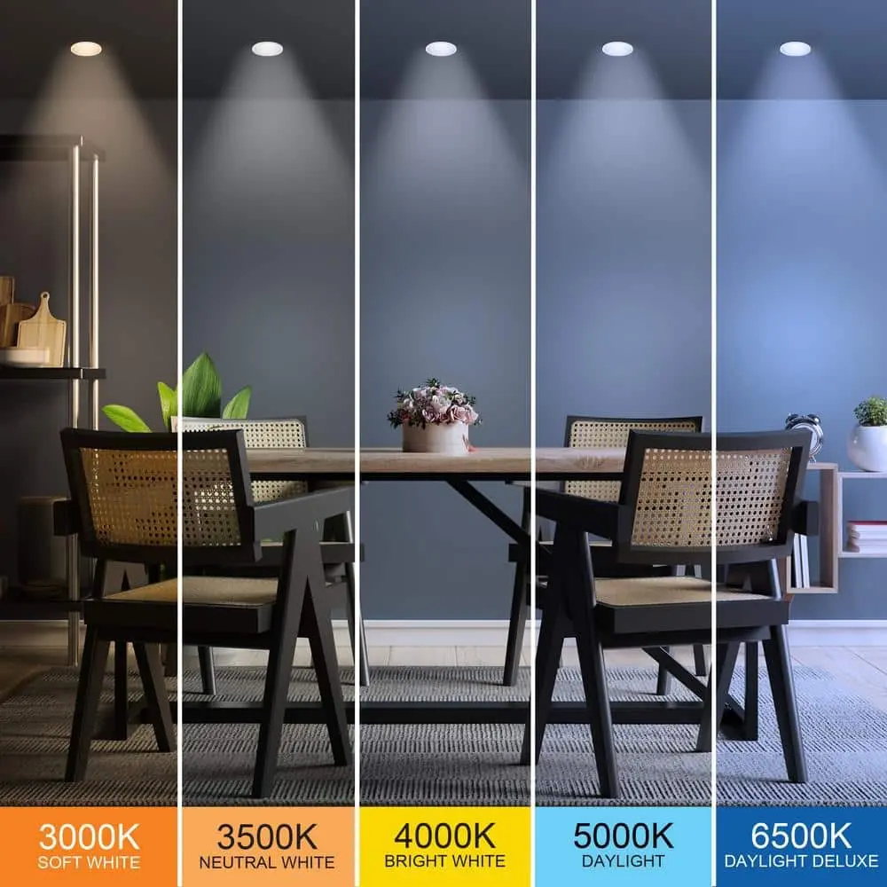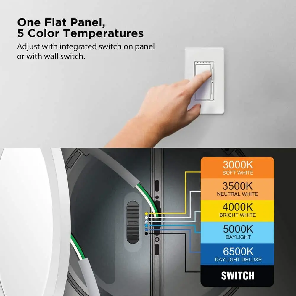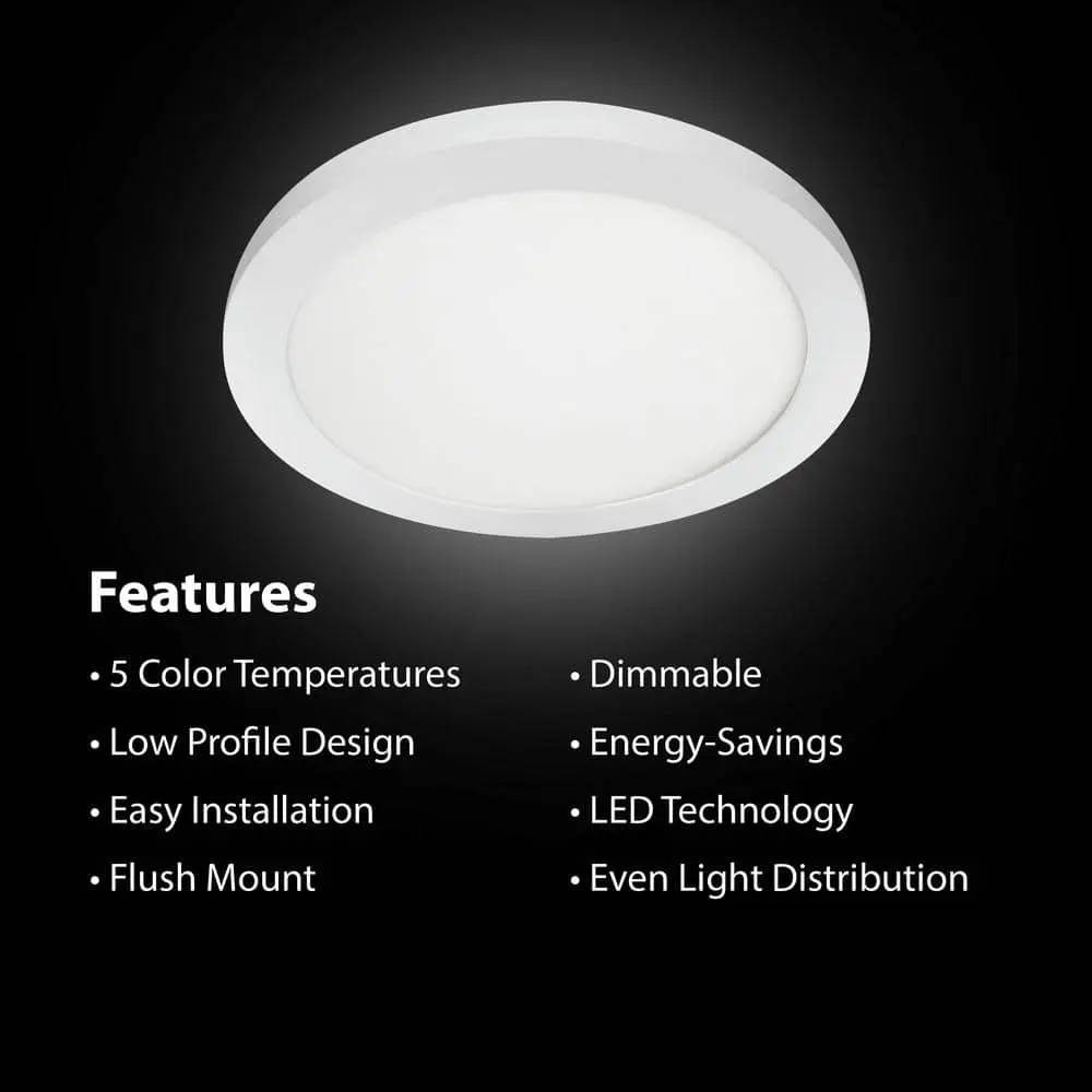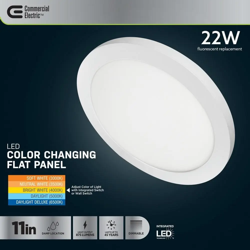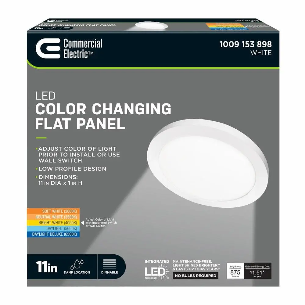 The Commercial Electric 11 in. White Round Dimmable LED Flush Mount Light Fixture offers customizable lighting for any space. Its ultra-slim, low-profile design (less than 1 inch thick) is perfect for low ceilings, while edge-lit LEDs provide even, glare-free illumination with no bulbs to replace. The selectable color temperature switch lets you choose from soft white, neutral white, bright white, daylight, or daylight deluxe (3000K/3500K/4000K/5000K/6500K) or easily toggle between them using a standard light switch. This energy-efficient fixture consumes only 12.5 watts, producing 875 lumens while using up to 80% less energy than incandescent bulbs. Designed for both residential and commercial applications, it features full-range dimming (with a compatible dimmer), a long 50,000-hour lifespan, and an easy slide-and-lock mounting bracket for quick installation.